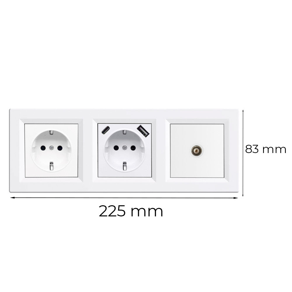 Ez a Nova szett három gyakran használt funkciót egyesít egyetlen elegáns, vízszintes modulban: egy földelt konnektort, egy USB-A és USB-C kimenettel ellátott aljzatot, valamint egy koaxiális TV csatlakozót. Ideális választás nappaliba, hálószobába, dolgozószobába, ahol fontos az egyszerűség, a megbízhatóság és a rendezettség.