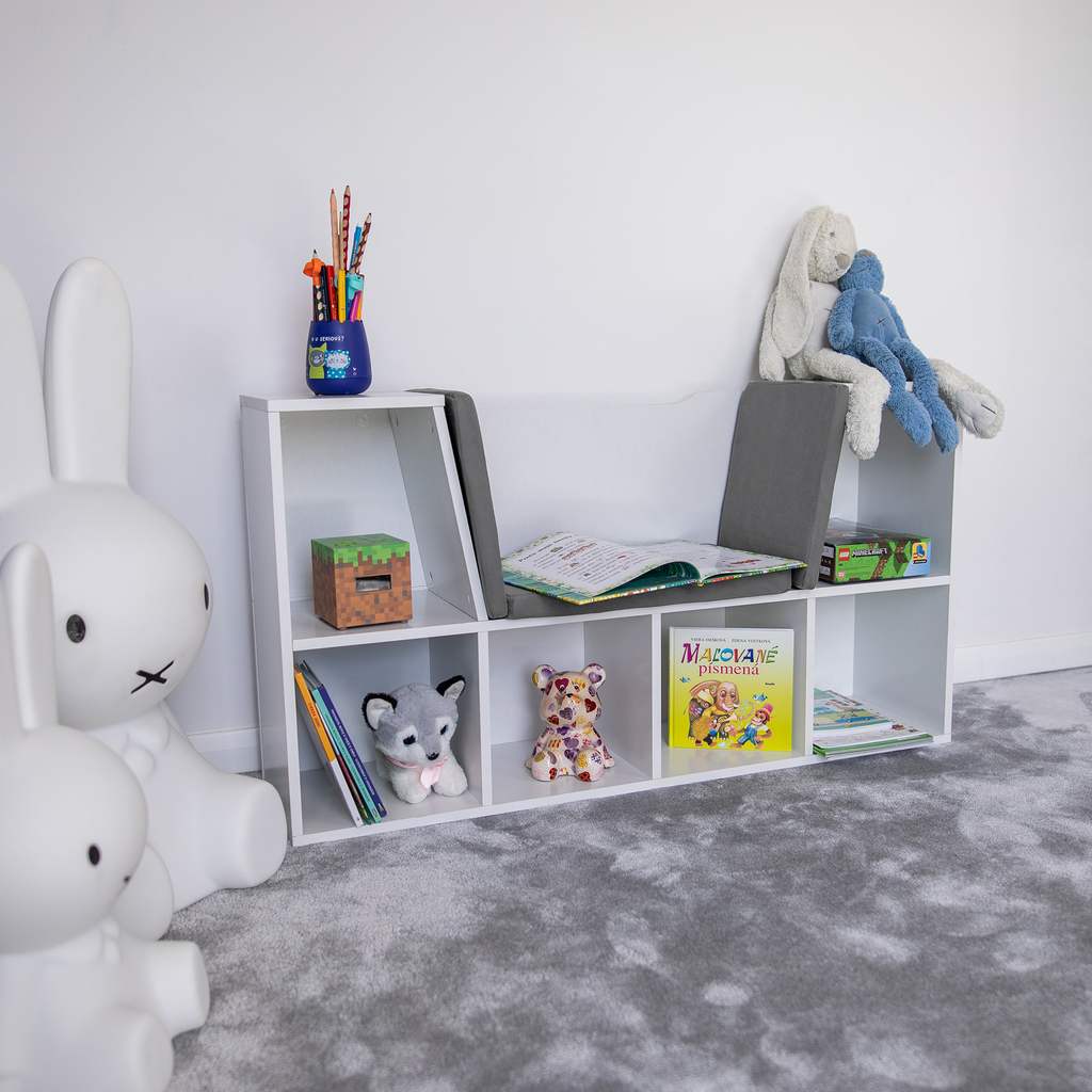 Szerkezet anyaga: DTD laminált Szerkezet színe: fehér Párna anyaga: szövet Párna színe: szürke Méretek (SzxMéxMa): 112x27x61 cm Három párna Hat polc Ülőhellyel Gyerekszobába Az ülőhelyek teherbírása: 50 kg Óvodába, klubházba Szétszerelve szállítjuk