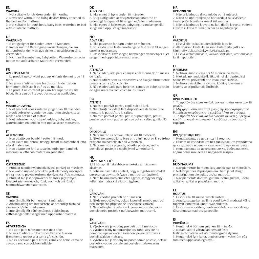 A mosható poliészterszövetből és könnyű fémcsőből készült ágyrács strapabíró, tartós és könnyen tisztítható. Mindkét oldalán egy-egy gombbal rendelkezik, így könnyen kombinálható. Emellett az ágytakaró magassága szabadon állítható, hogy megtalálja a legbiztonságosabb magasságot. Kérjük, vegye figyelembe, hogy ez az ágyrács 18 hónapos és 5 éves kor közötti gyermekek számára alkalmas. A legtöbb 3-25 cm vastagságú matraccal rendelkező ágyhoz használható, kivéve emeletes ágyakhoz, babaágyakhoz, vízágyhoz vagy felfújható matraccal ellátott ágyhoz.