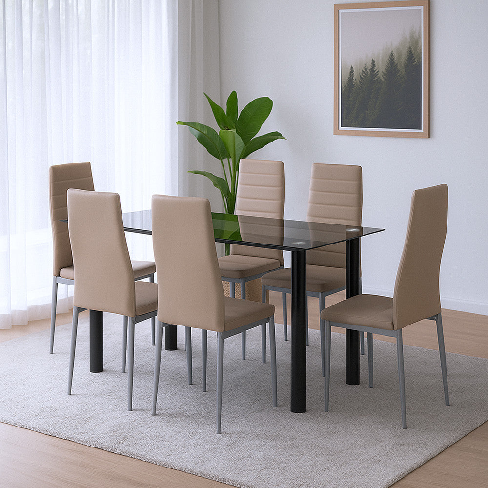 A bézs-szürke színkombináció remekül harmonizál a füstszürke üvegasztal színvilágával, így a teljes szett vizuálisan is egységes és kiegyensúlyozott.