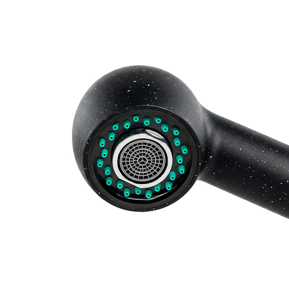 A Carol fekete csaptelep különlegessége, hogy színe és textúrája illeszkedik a fekete gránit mosogatókhoz. A finom, szeplős mintázat és a selyemfényű felület természetes, harmonikus összhatást teremt, így a csaptelep nemcsak használati eszköz, hanem a konyha látványeleme is.