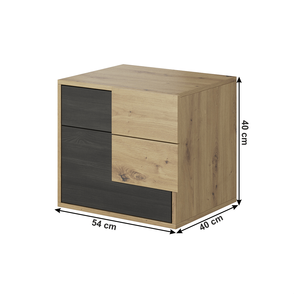 Éjjeliszekrény BAFRA Szín: fekete fenyő/artisan tölgy Anyag: laminált DTD/ABS élek Méretei (SzéxMéxMa): 54x40x40 cm 2 fiók Bontásban szállítva.