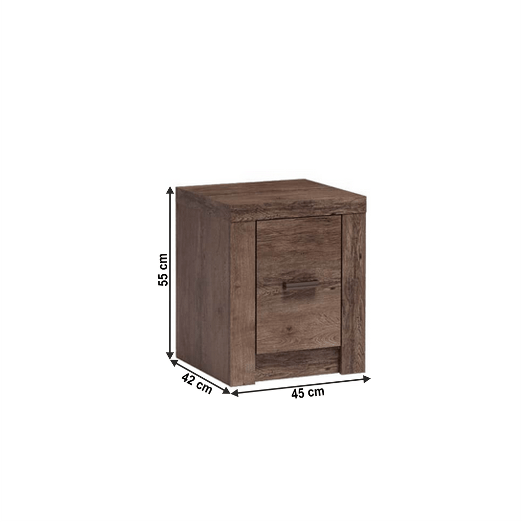 Éjjeliszekrény luxus elemes bútorból Váz vastagsága: 48 mm Fém fogantyúk Anyag: laminált DTD/ABS élek Színváltozat: sötét kőris Méretek (SzéxMéxMa): 45x42x55 cm Szállítás szétszerelve