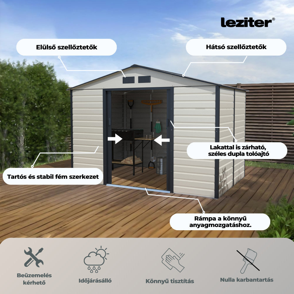 - Kényelmes bejárat: Az ajtó mérete 117 x 160 cm, ami elegendő helyet biztosít a nagyobb tárgyak egyszerű be- és kihordásához. A két széles, tolóajtóhoz praktikus rámpa is tartozik, amely megkönnyíti a nagyobb eszközök mozgatását, így a tároló még kényelmesebb és praktikusabb a mindennapi használat során.