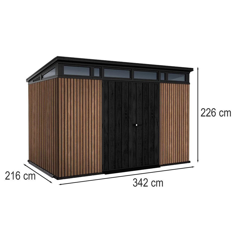A Signature PENT 11x7 kerti ház ötvözi az esztétikát és a funkcionalitást. A ferde tető és letisztult vonalvezetés tökéletesen illeszkedik a modern kertépítési trendekhez, míg a velencei barna színű DECOCOAT technológia időjárásálló felületet biztosít.