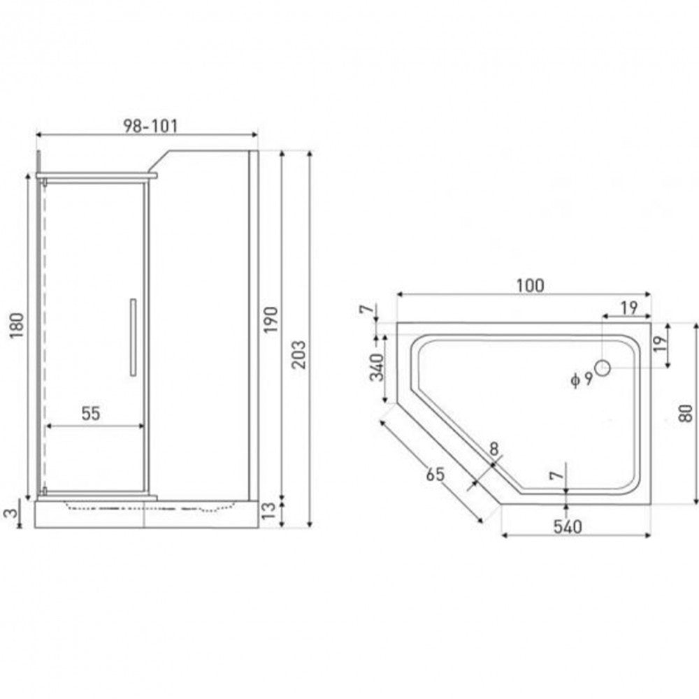 A zuhanykabin 6 mm-es edzett víztiszta biztonsági üveggel van ellátva.A zuhanykabin szögletes kivitelben kapható. A zuhanykabin 80x100x190 cm-es, zuhanytálcával 100x80x203 cm-es.A kabin szerelhető zuhanytálcával vagy közvetlenül a padlóra helyezve (a tálca külön megvásárolható). A kabin jobbos és balos kivitelben is szerelhető.