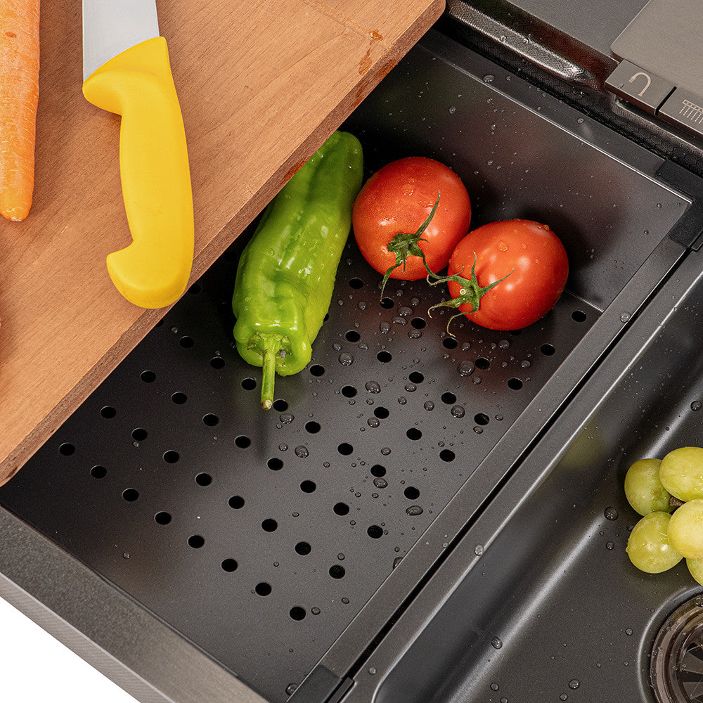 - Mosótál zárható lefolyóval, amely megkönnyíti az edények és zöldségek előkészítését.