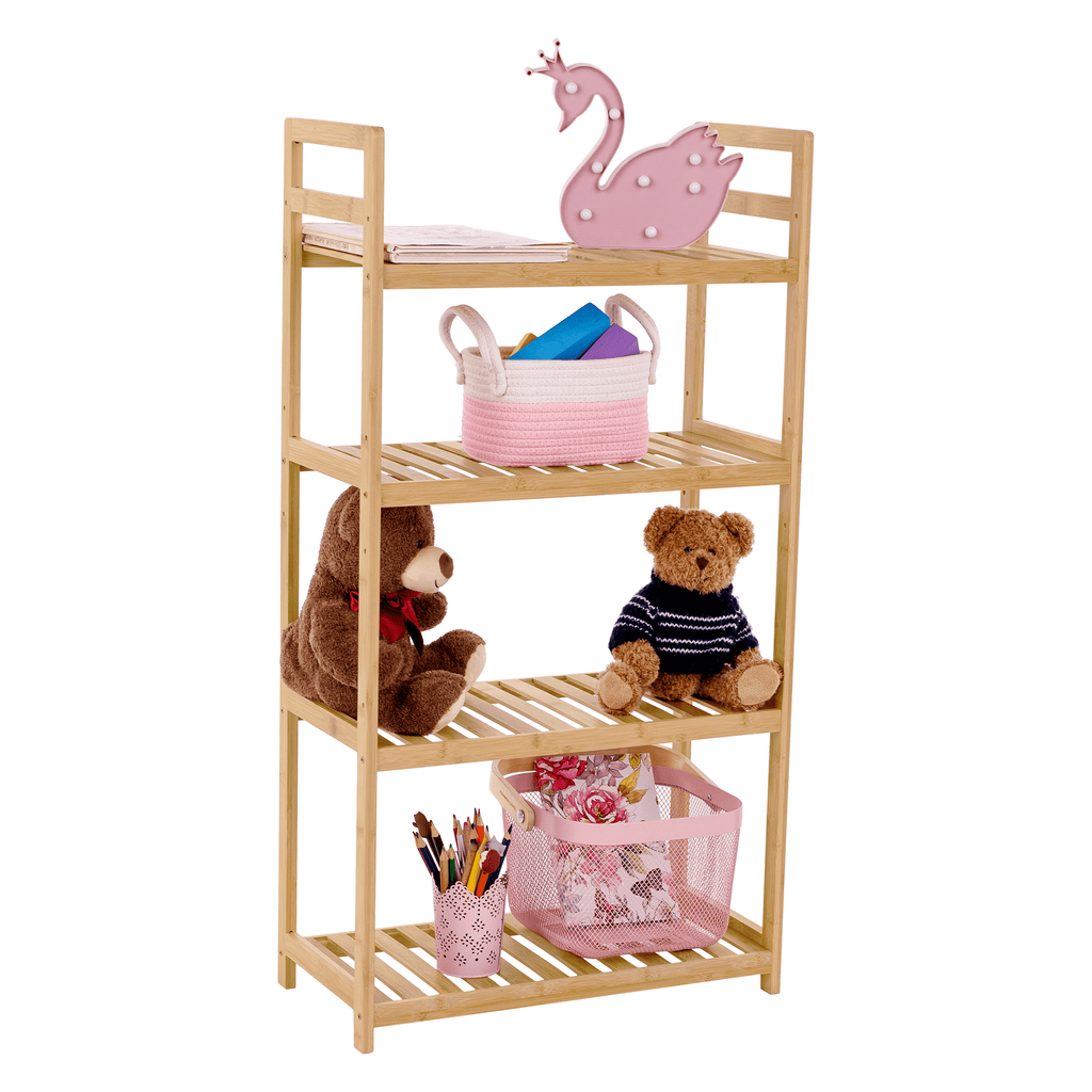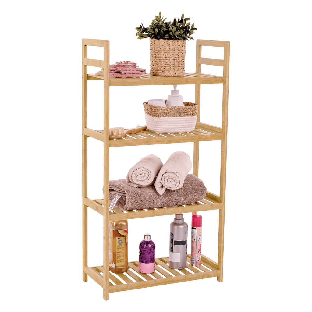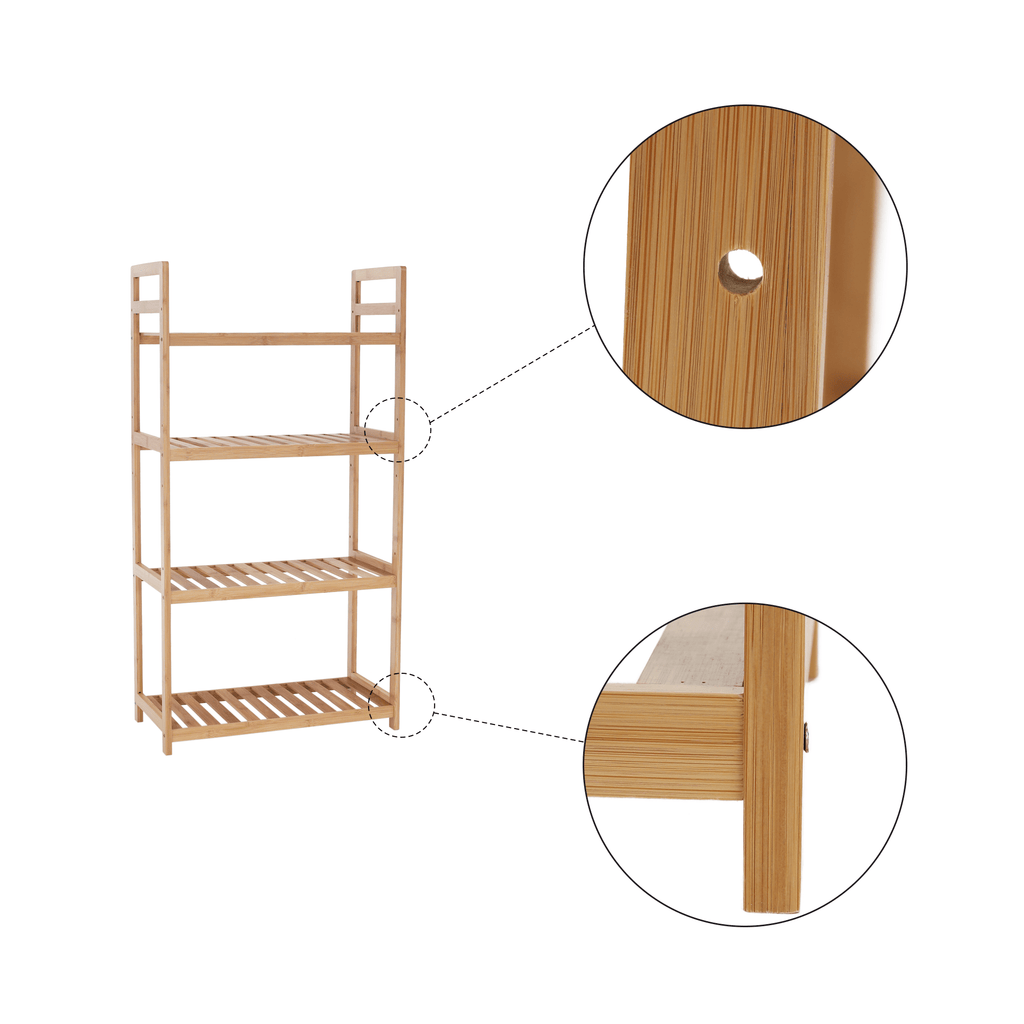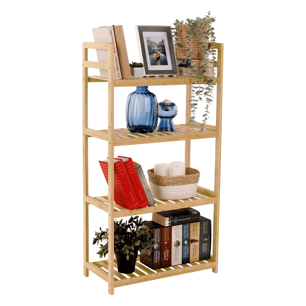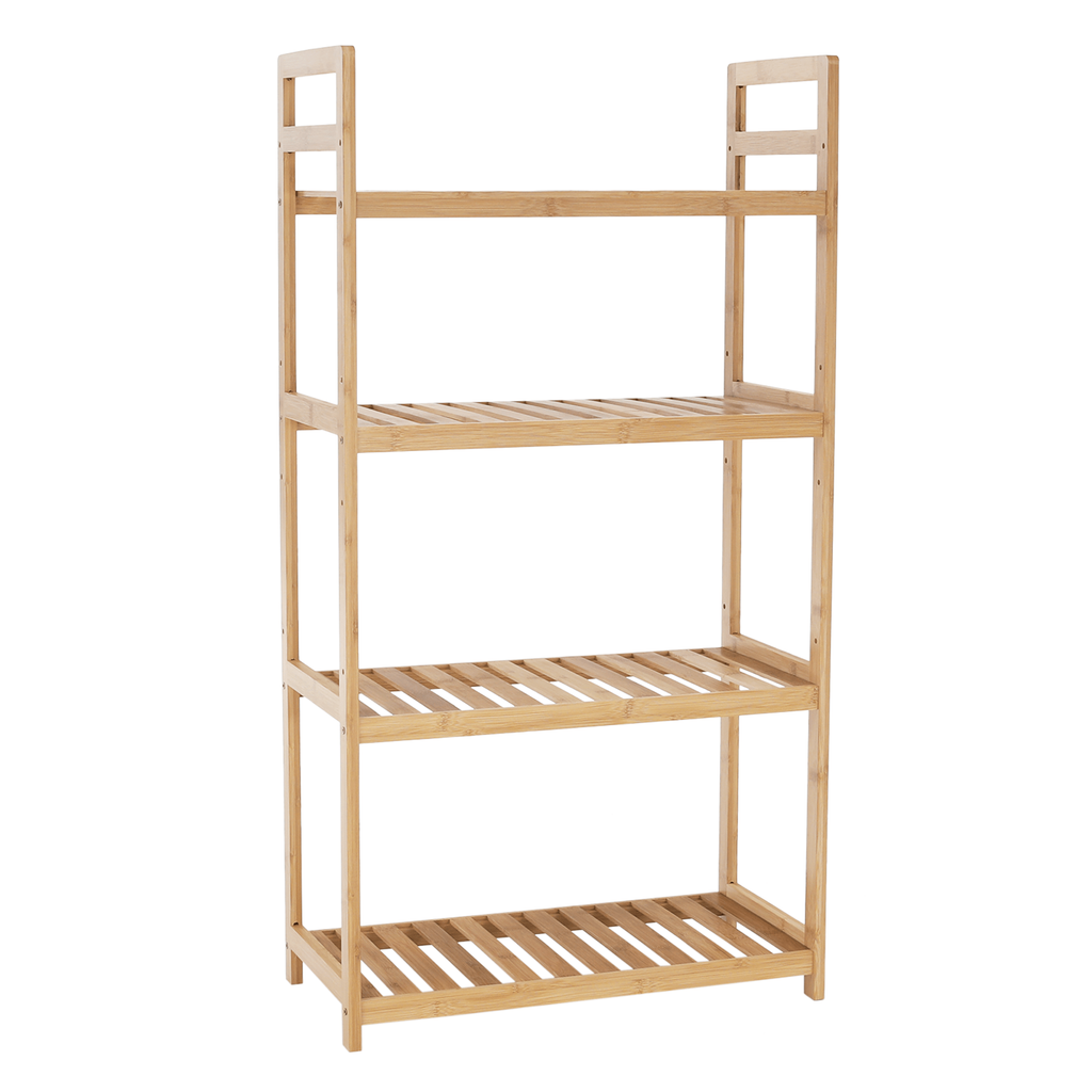 Anyag: lakkozott bambusz Szín: természetes bambusz Méretek (SzxMéxMa): 53x26x100 cm 4 polcos Állítható magasságú polcok Többfunkciós Modern Praktikus Teherbírás:40 kg Bontásban szállítva