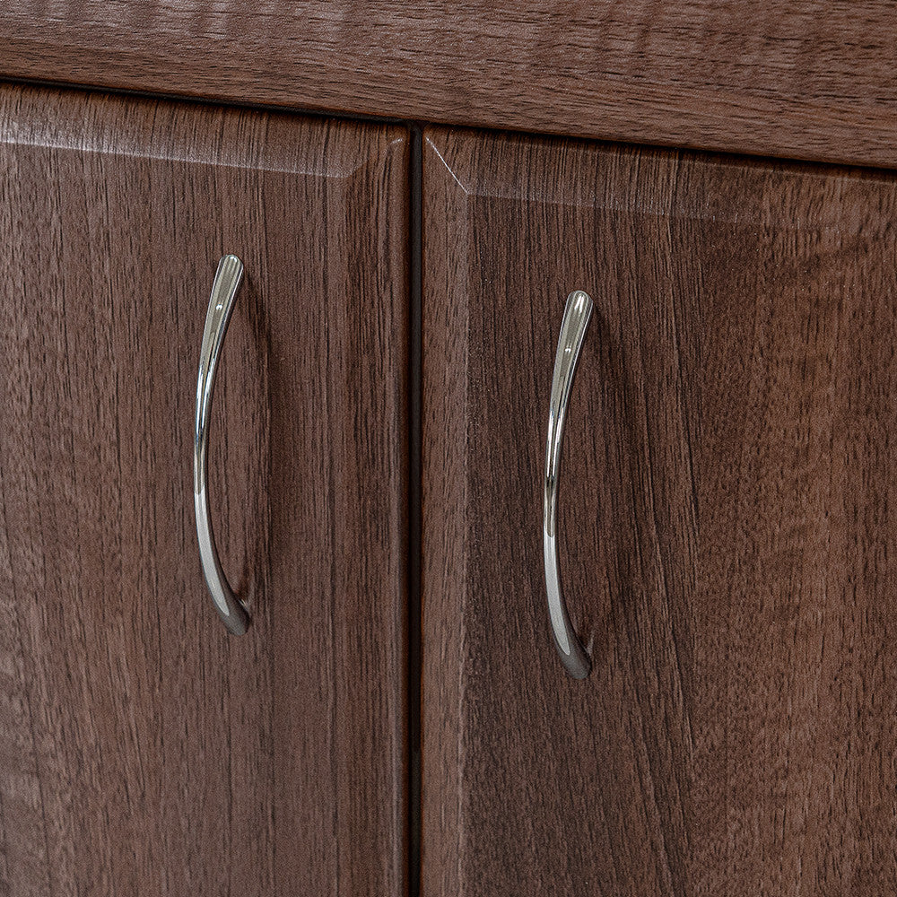 A szekrény többajtós kialakítással és két praktikus fiókkal rendelkezik, amelyek elegendő helyet kínálnak törölközők, kozmetikumok vagy tisztítószerek tárolására. A szekrény elegáns, krómozott fogantyúkkal van ellátva a könnyű használat érdekében.