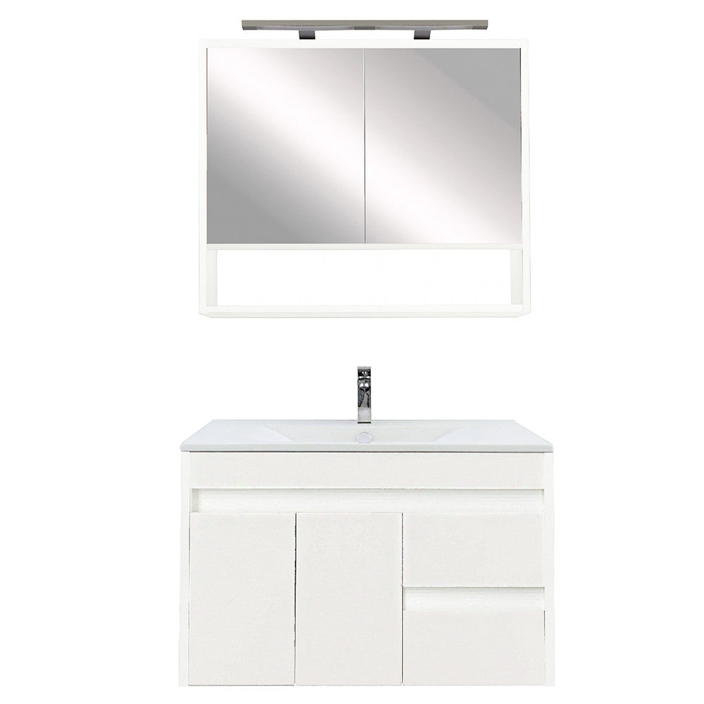 A fürdőszoba bútor tágas fiókokkal és felső szekrénnyel rendelkezik ahol kényelmesen elférnek a fürdőszobai pipere eszközök. Kompakt kialakítása miatt kisebb fürdőszobák berendezésére is alkalmas, például panel lakásokban. A termék magas minőségű bútorlapból készül és színben passzoló élzárókkal van ellátva. A fürdőszoba bútor felfüggesztett kivitelben kapható.