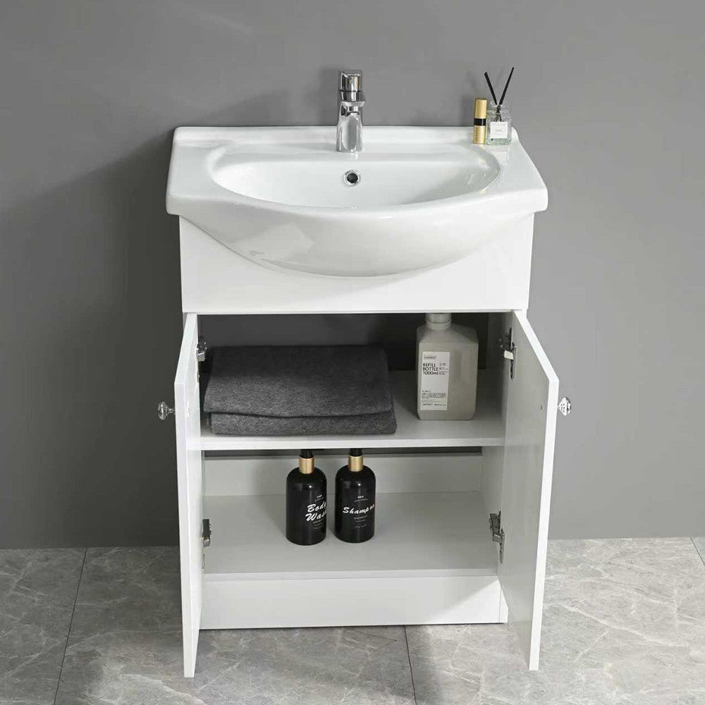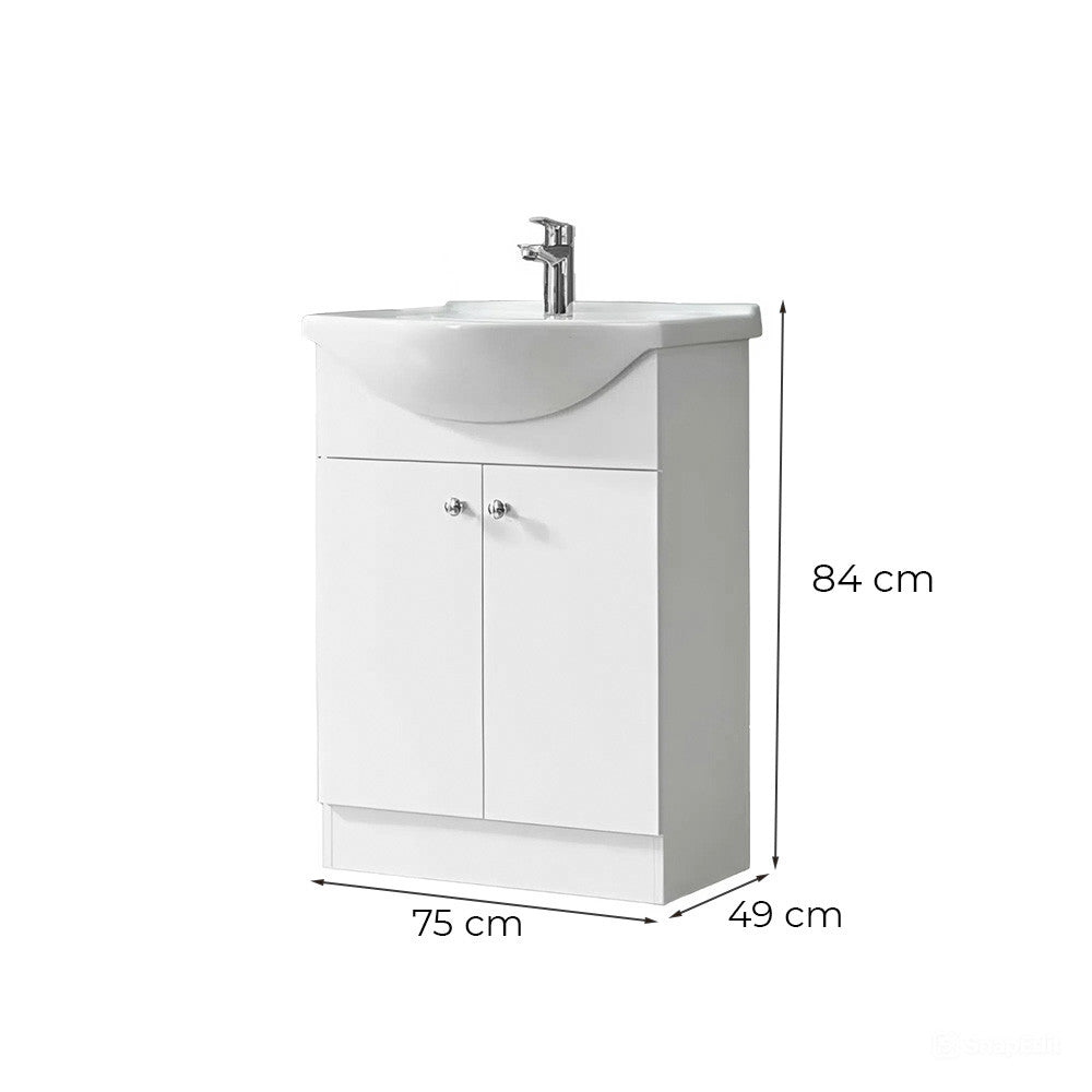 A szekrény 15 mm vastag MDF-ből készült, fényes fehér festéssel, amely letisztult és időtálló dizájnt nyújt. A strapabíró kerámia mosdó higiénikus, könnyen tisztítható felületet biztosít, a kétajtós tárolórész pedig ideális a mindennapi kellékek rendszerezéséhez.