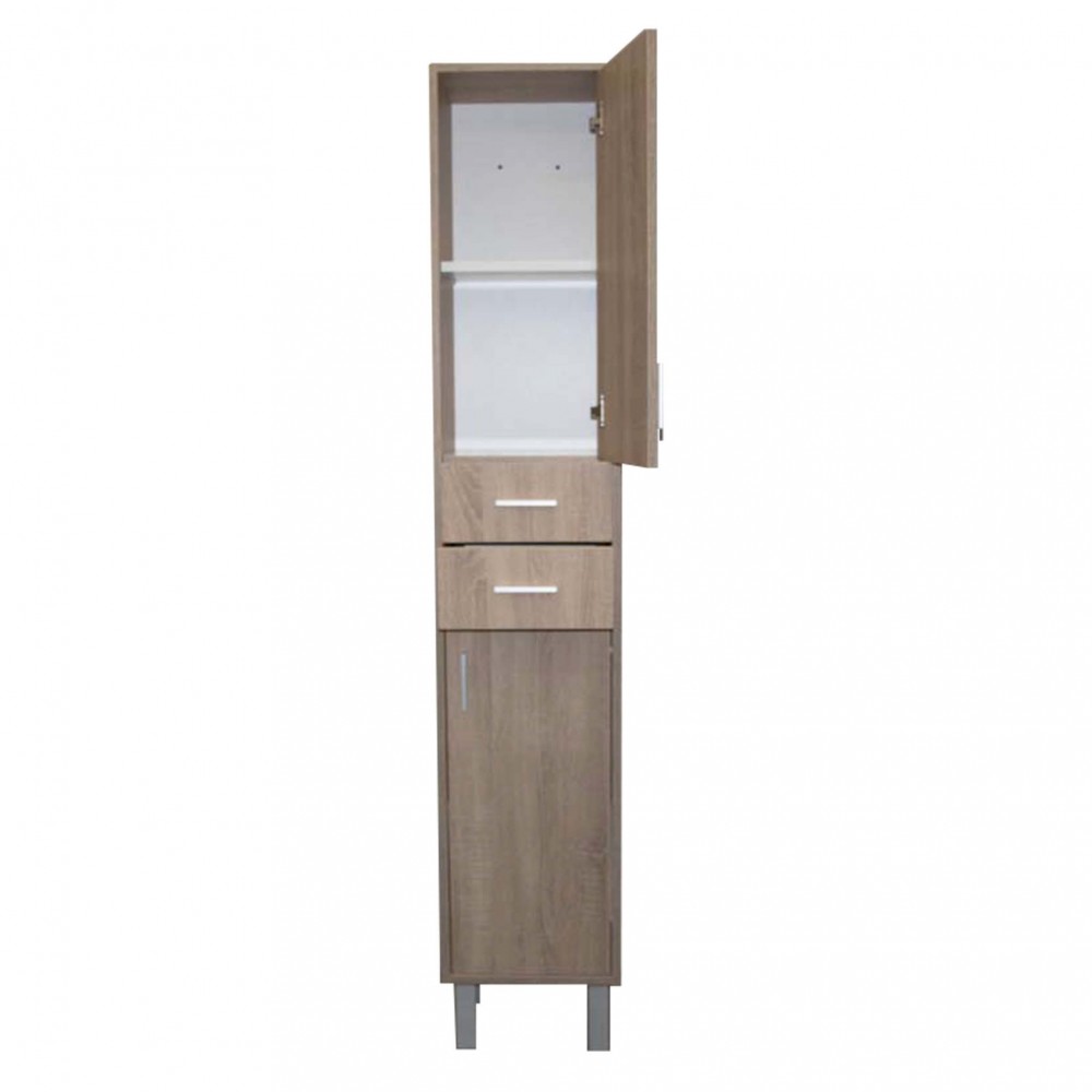 A fürdőszoba bútor kevés helyet foglal viszont rendelkezik két egy ajtós szekrénnyel és két tágas fiókkal ahol kényelmesen elférnek a fürdőszobai pipere eszközök. Kevés helyigénye miatt kisebb fürdőszobák berendezésére is alkalmas, például panel lakásokban. A termék magas minőségű bútorlapból készül és színben passzoló élzárókkal van ellátva. A fürdőszoba bútor álló kivitelben kapható.
