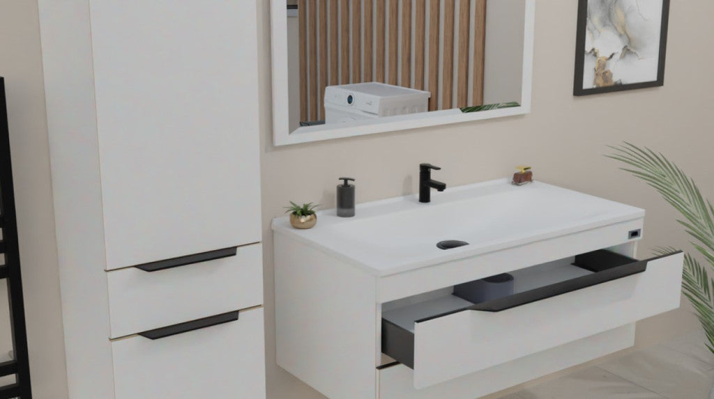 A TMP VOX 100 fürdőszobabútor festett MDF anyagból készült, amely tartósságot és könnyű tisztítást biztosít. A fehér szín friss és időtlen megjelenést kölcsönöz a fürdőszobának, harmonizálva a különböző stílusú fürdőszobákkal.