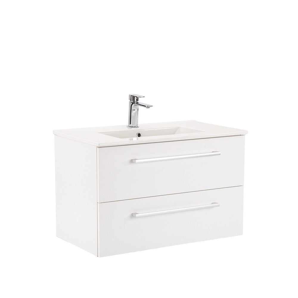 A Vario Clam 80 komplett fürdőszobabútor egy stílusos és praktikus választás modern fürdőszobához. Kompakt méretei ideálisak kisebb és közepes méretű fürdőszobákba is, és a fém fogantyú profil patinás hatást, az fehér-fehér színű dizájn elegáns megjelenést kölcsönöz a térnek. A csillapítós fiókzáródás és a felfüggesztett kivitel a kényelmet és könnyű tisztántartást szolgálja, míg a minőségi anyagok hosszú élettartamot biztosítanak.