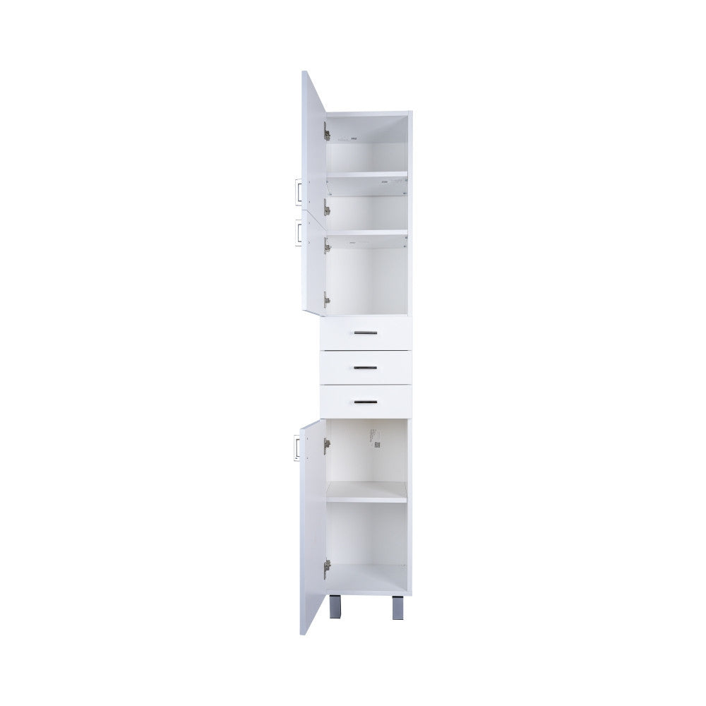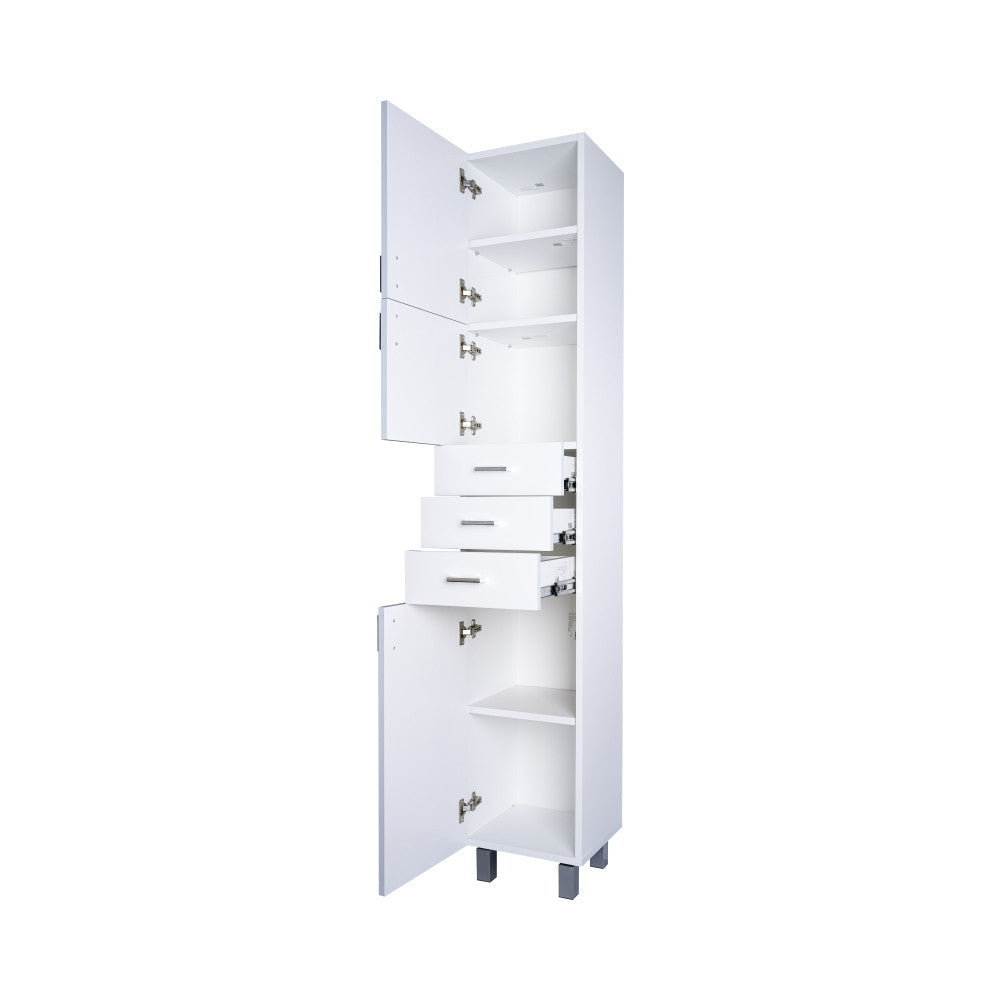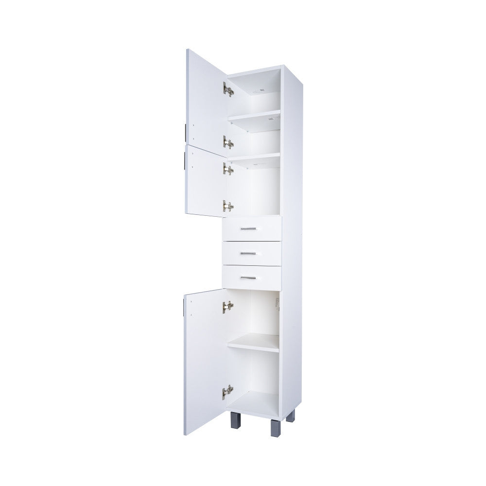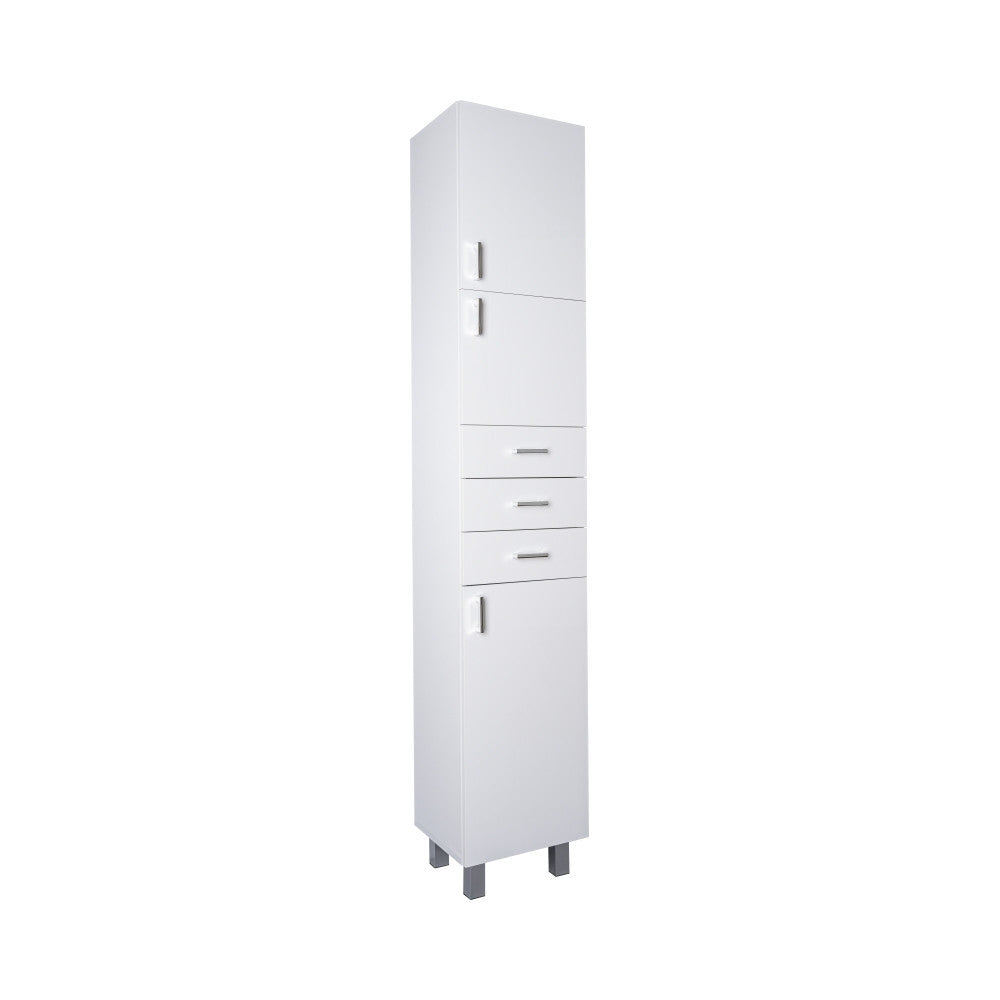 Az Állószekrény magas polcos praktikus és hasznos megoldást kínál. Polcaiban tárolhatók a kisebb ruhaneműk, törölközők vagy tisztító és tisztálkodó eszközök és szerek. Ezen felül még 3 fiókkal rendelkezik. Fehér színével szinte mindenhová beilleszkedik és esztétikus környezetet teremt. Rendezze be úgy fürdőszobáját, hogy a végeredmény örömet szerezzen a szemnek és szolgáljon sokáig!