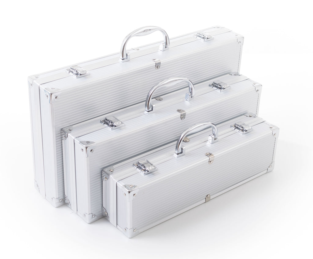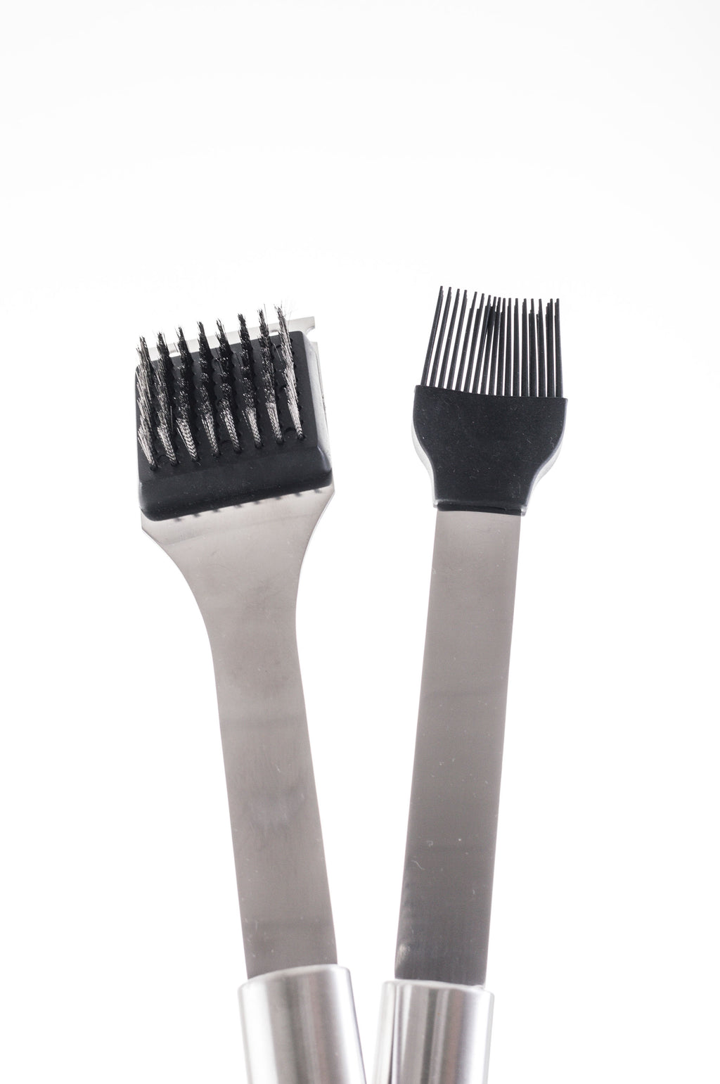 A készlet tartalmaz minden eszközt a gond nélküli grillezéshez. A készlet része egy húsforgató, villa, csipesz, kenőecset, tisztító kefe, pálcikák kukoricára és nyárstűk. Az eszközök 40 cm-es hossza biztosítja, hogy grillezés közben a lángok nem égetik Önt meg és nem fog Önre fröcsögni az olaj. Az egyszerű áthelyezés és tárolás érdekében az eszközök egy praktikus alumínium bőröndbe van elhelyezve.