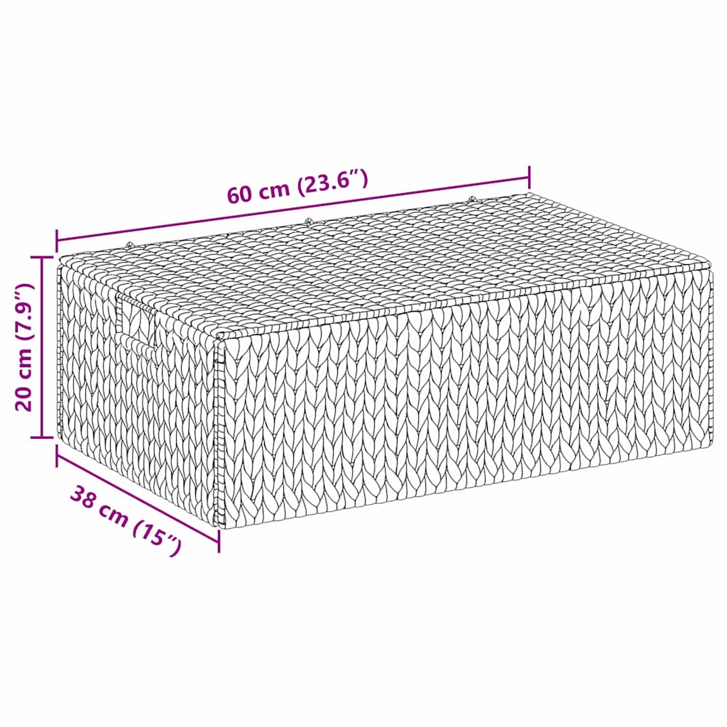 A Tároló Doboz egy szuper elegáns és sokoldalú darab, ami tökéletes bármilyen otthonba. Vintage bájjal és modern kényelemmel rendelkezik. Téglalap alakú formája miatt rengeteg helyen használható, a nappaliban vagy a hálószobában is. A természetes vízi jácint textúrája barátságos, kellemes atmoszférát teremt. Könnyű súlya és praktikus kialakítása miatt könnyedén mozgatható, így bárhol megállja a helyét, legyen szó egy tanulósarokról vagy egy forgalmas irodáról.