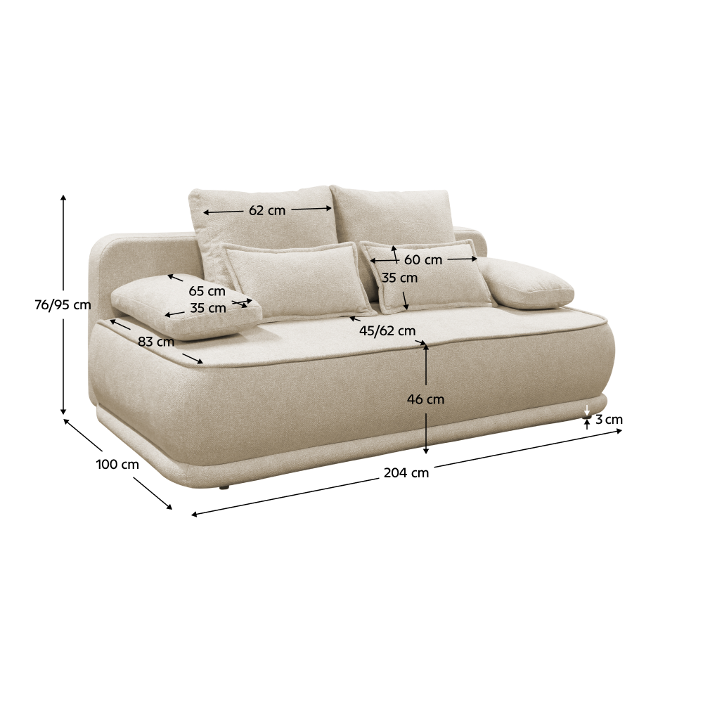 Méretek (SzxMéxMa): 204x103x76/95 cm