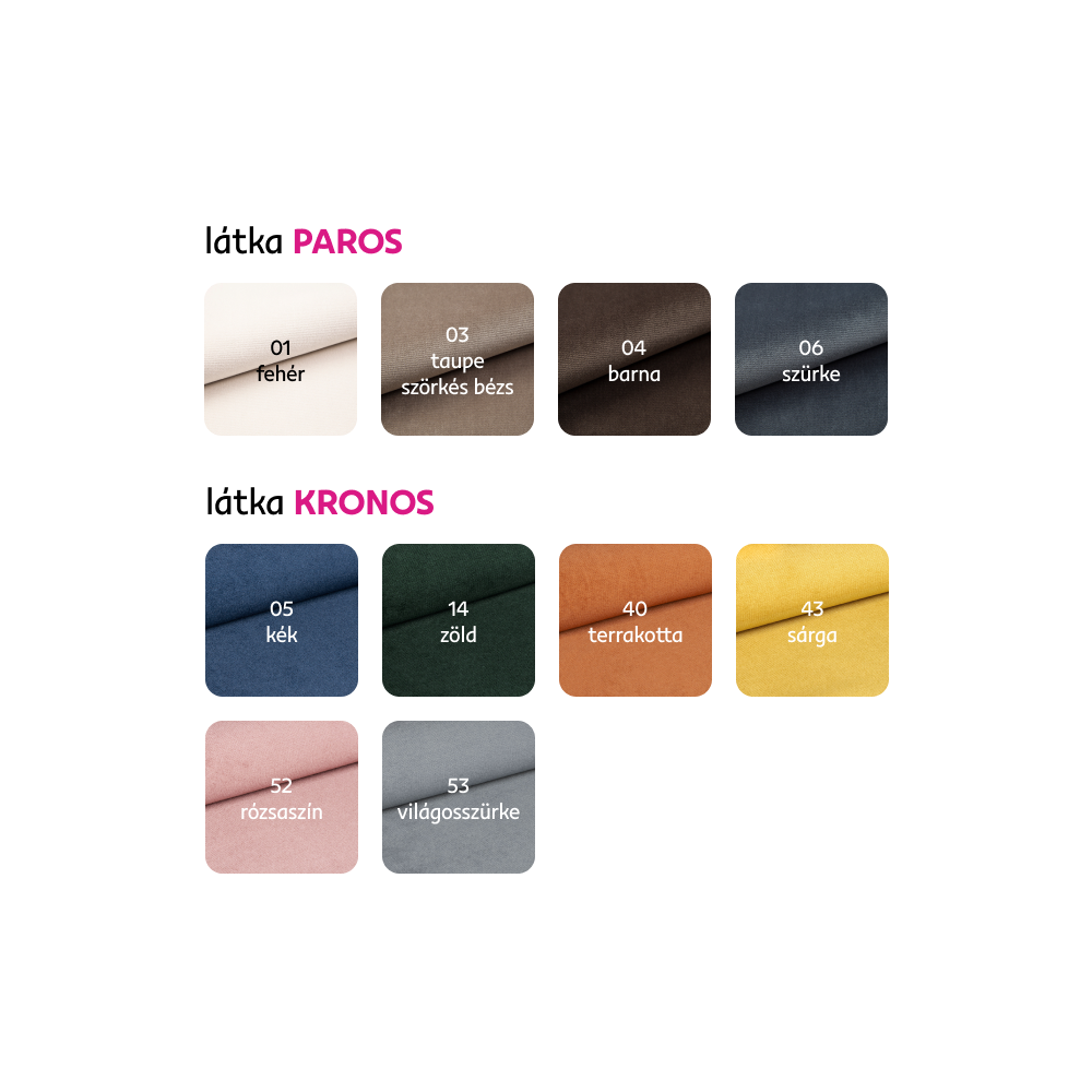 Megrendelhető a Paros szövet 4 színváltozatában és a Kronos szövet 6 színváltozatában ár: 302 500 Ft., 6-8 hetes szállítási idővel. Egyedi rendelés esetén a teljes összeg 20%-át előlegként szükséges befizetni. Az előleg befizetése után a rendelés gyártásba kerül.