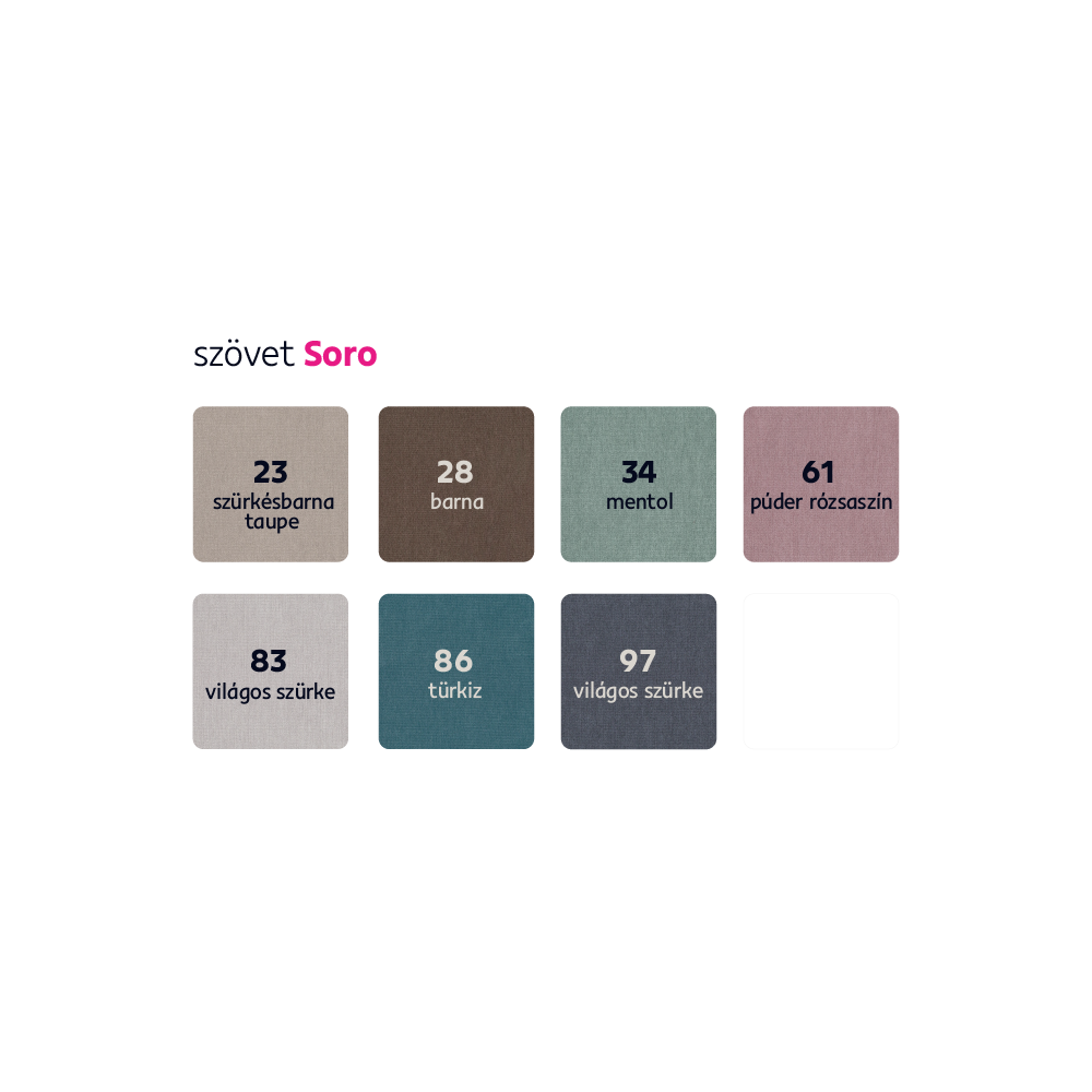 A Soro szövet 7 színárnyalatában rendelhető ár 633 900 Ft. A szállítási idő 6-8 hét. Egyedi megrendelés esetén az összeg 20%-át előlegként szükséges befizetni. Az előleg befizetése után a megrendelése gyártásba kerül.