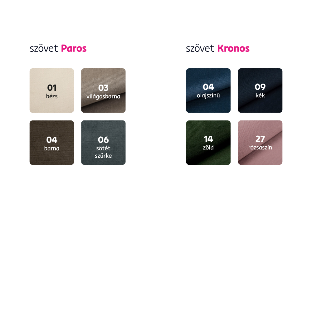 Megrendelhető a Paros szövet 4 színárnyalatában és a Kronos szövet 4 színárnyalatban 6-8 hét szállítási idővel. Egyedi megrendelés esetén az összeg 20%-át előlegként szükséges befizetni. Az előleg befizetése után a megrendelése gyártásba kerül.