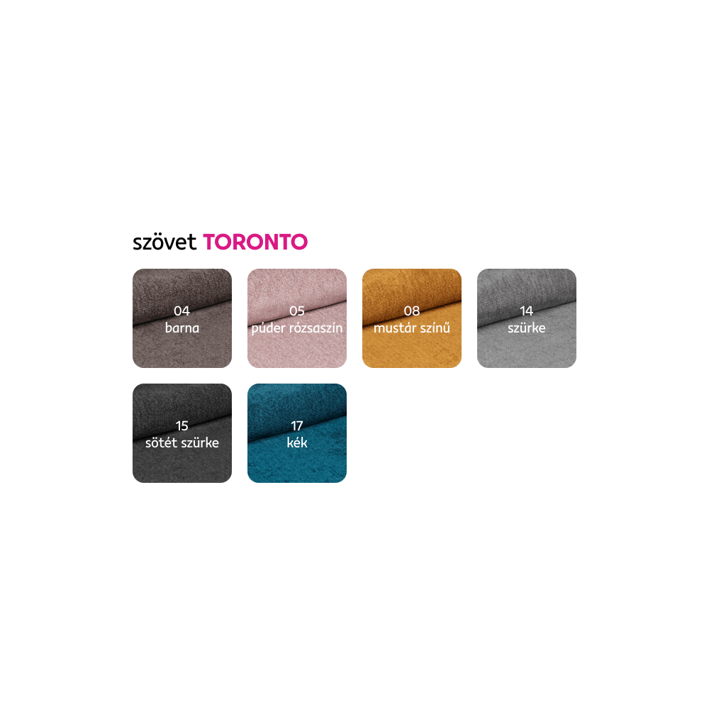 Megrendelhető a Toronto szövet 6 színváltozatában, ár: 686 900 Ft. Egyedi megrendelés esetén a megadott összeg 20%-át előlegként szükséges befizetni. Az előleg befizetése után a kérése gyártásba kerül. A szállítási idő 6-8 hét.