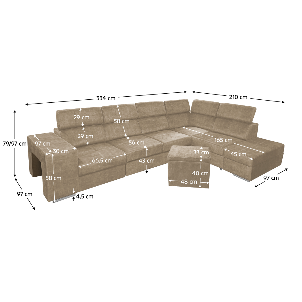Méretek (SzxMéxMa): 334x210x79/97 cm