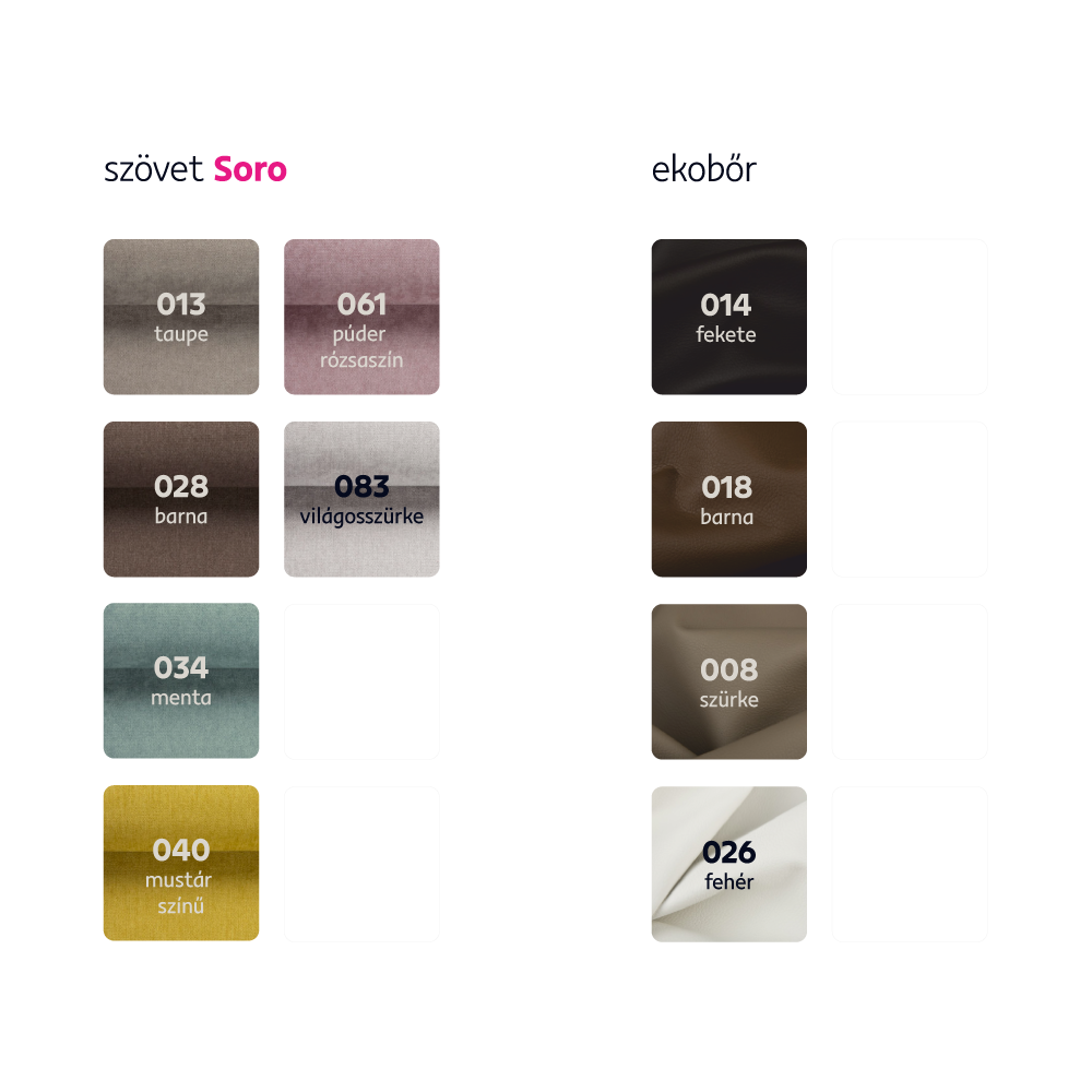 Megrendelhető a textilbőr 4 színváltozatában és a Soro szövet 6 színárnyalatában, ár 500 900 Ft. Elérhető szövet + ekobőr kombinációban vagy teljesen szövetből. Egyedi megrendelés esetén szükség van az adott összegnek a 20%-át befizetni,mint előleg. Az előleg befizetése után az Ön követelményét benyújtjuk a gyártónak. Szállítási idő: 6-8 hét.