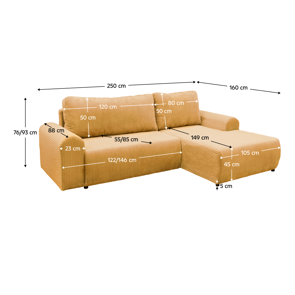 Méretek (SzxMéxMa): 250x160x76/93 cm