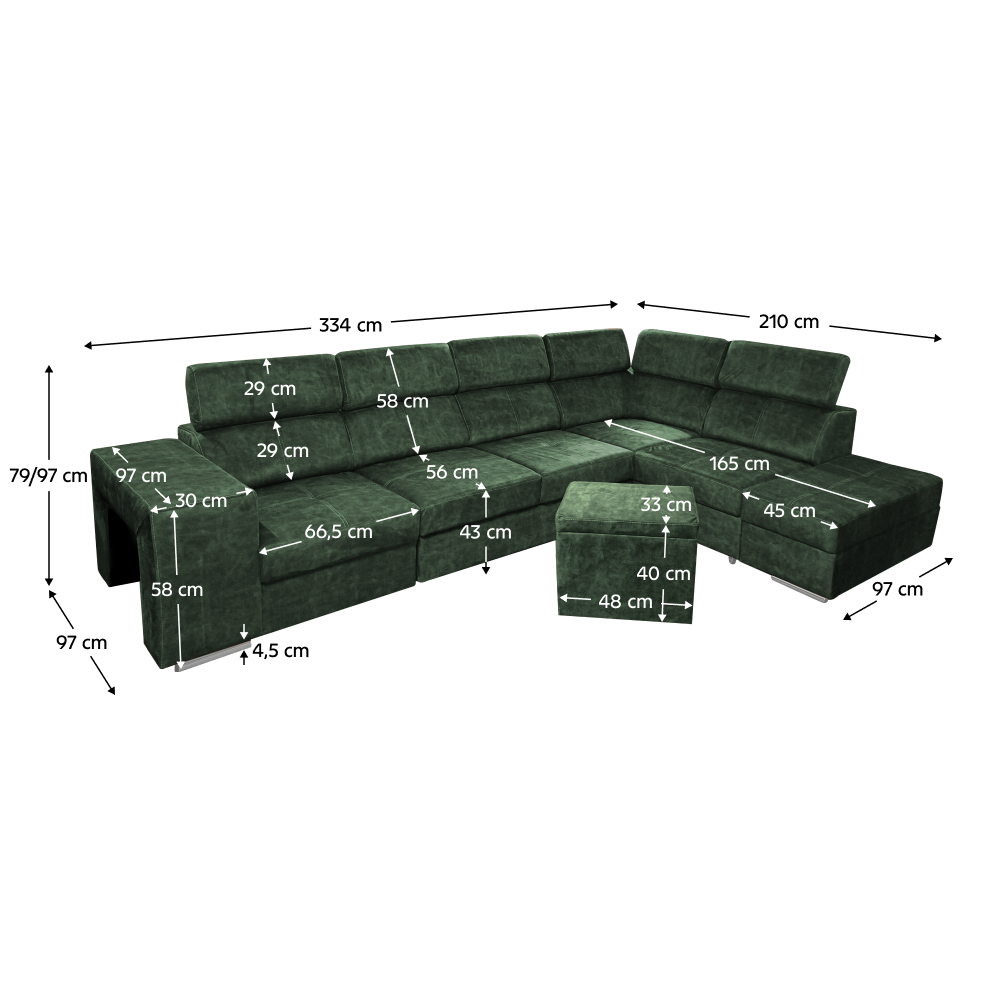 Méretek (SzxMéxMa): 334x210x79/97 cm