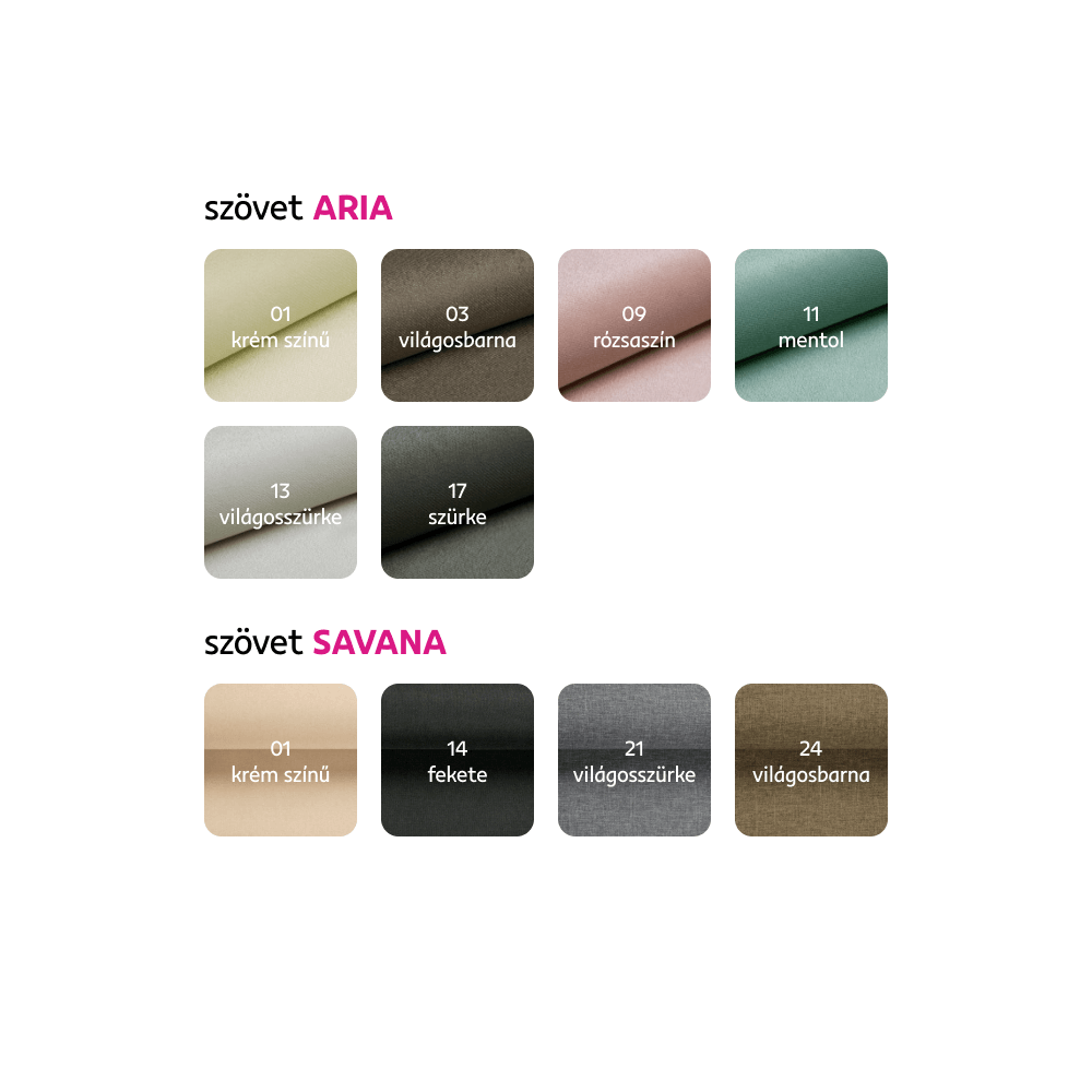Az ülőgarnitúra más színben is rendelhető. Lehetősége van választani az Aria szövet hat árnyalatából és a Savana szövet négy színéből. Választhat a Savana vagy Aria szövet hat színváltozatából. Választását jelölje meg közvetlenül a megrendelőlapon. .Ar: 710 500 Ft. Szállítási idő 8-10 hét.