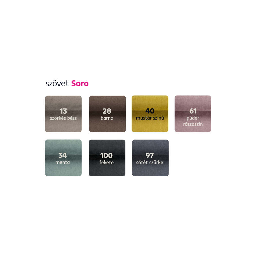 A kanapét a Soro szövet 7 színváltozatában megvásárolhatja a mintafüzet alapján 545 900 Ft áron. Választását közvetlenül a megrendelés megjegyzései közé írja be. Egyedi megrendelés esetén az adott összeg 20%-át előlegként szükséges befizetni. Az előleg befizetése után a kérése gyártásba kerül. A szállítási idő 6-8 hét.