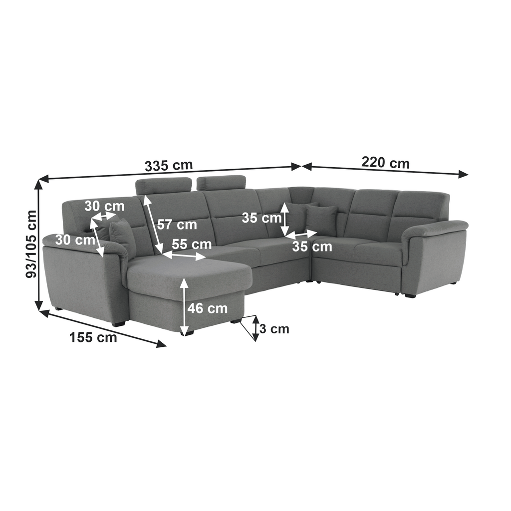 Méretek (SzéxMéxMa): 335x220/155x93/105 cm, fekvőterület (SzéxH): 125x270 cm