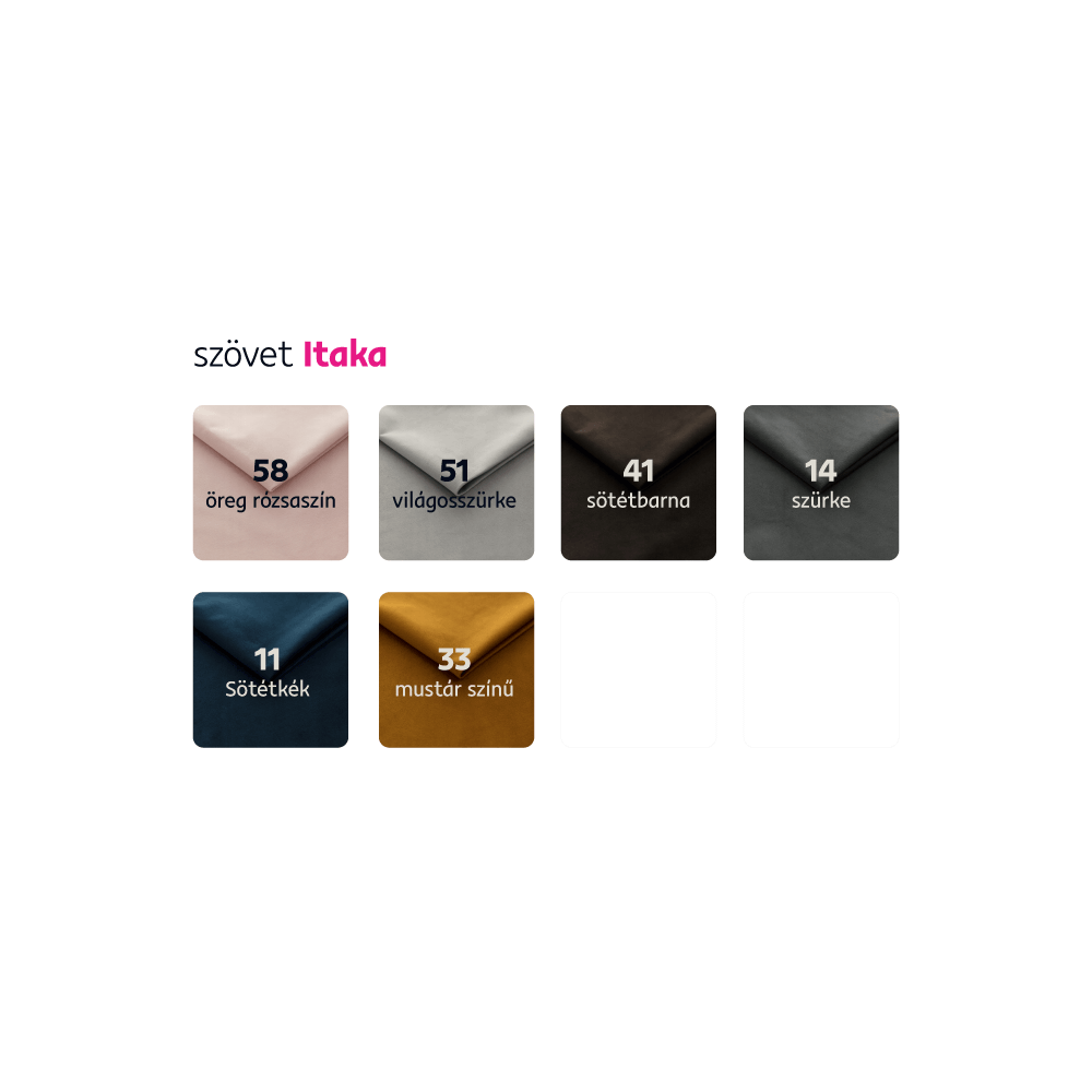 Az Itaka szövet 7 színváltozatában megrendelhető ár: 410 500 Ft. Egyedi megrendelés esetén az összeg 20%-át előlegként szükséges befizetni. Az előleg befizetése után a megrendelése gyártásba kerül. A szállítási idő 6-8 hét.