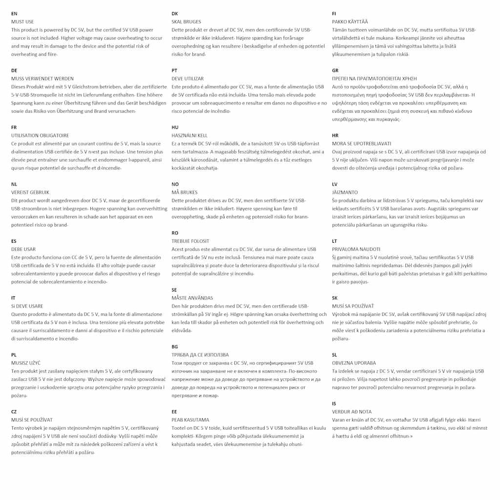 - A termék USB-csatlakozóval rendelkezik, amelyhez hitelesített, 5 V-os USB áramforrás szükséges (nem alaptartozék).