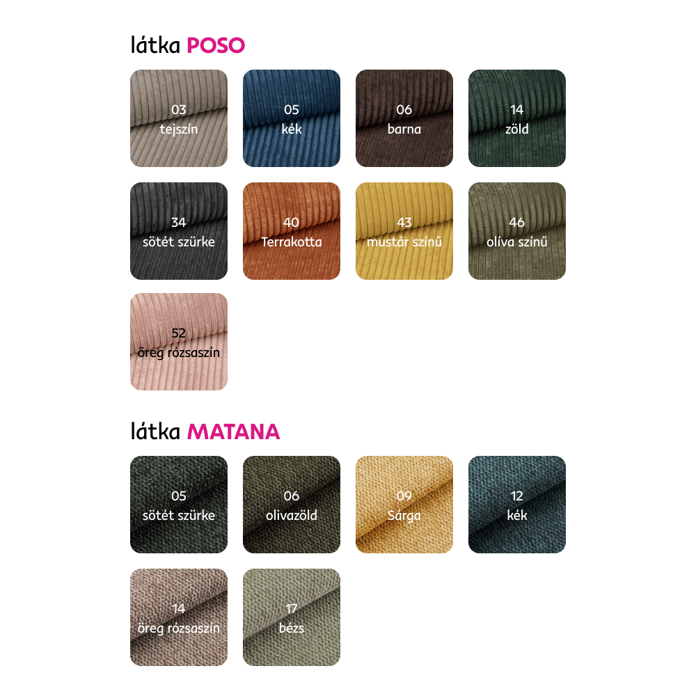 Megrendelhető a Poso szövet 9 színváltozatában és a Matana szövet 6 színváltozatában, fekete vagy bükkfa választási lehetőséggel ár: 80 500 Ft. Egyedi megrendelés esetén a megadott összeg 20%-át előlegként szükséges befizetni. Az előleg befizetése után kérése a gyártásba kerül. Szállítási idő 6-8 hét.