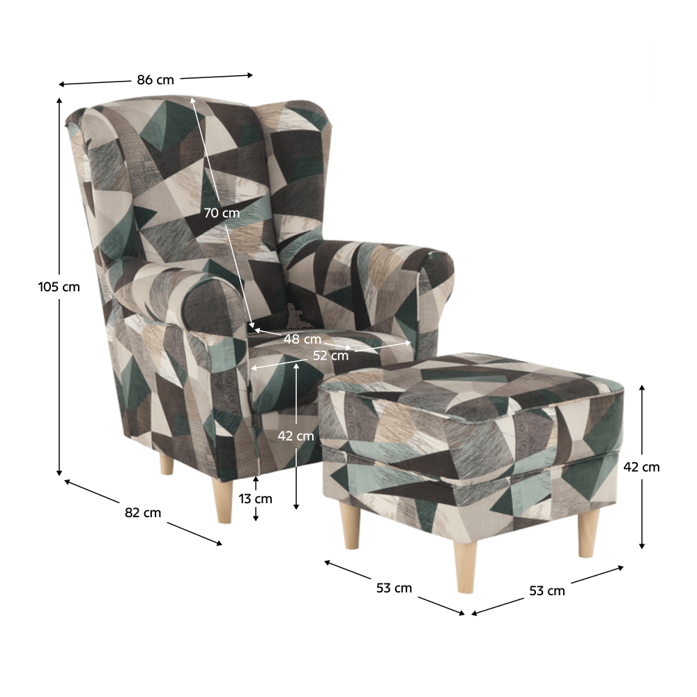 Méretek (SzéxMaxMé): Fotel - 86x105x82 cm, Puff - 53x42x53 cm,