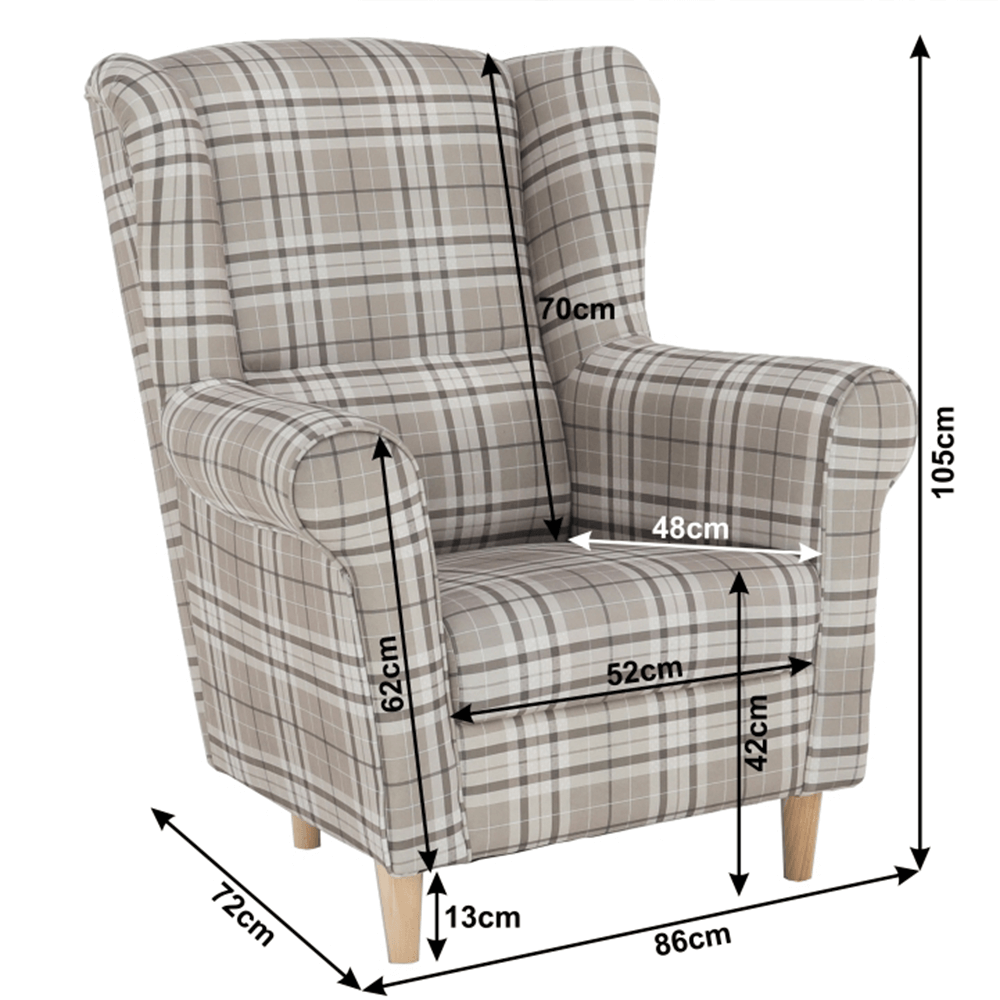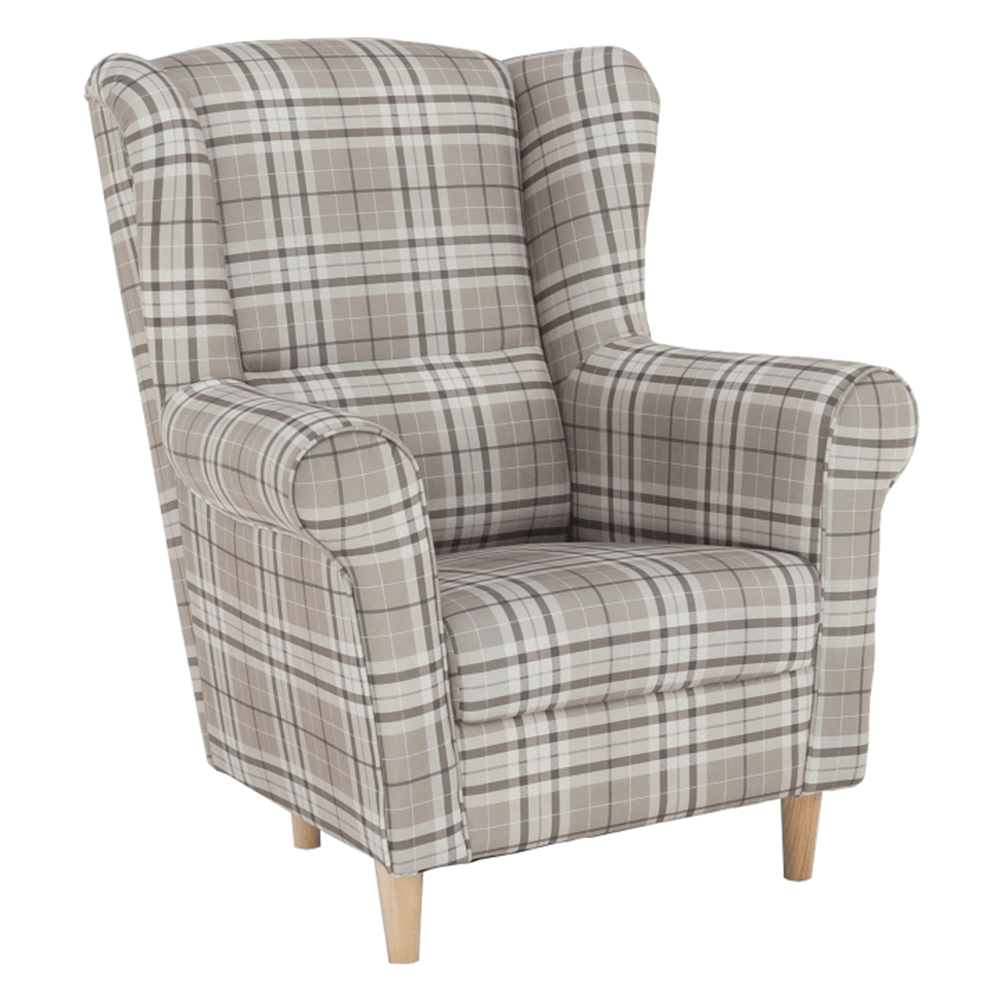 Füles fotel CHARLOT barna kockás szövet változatban. Falábak bükk színváltozatban.