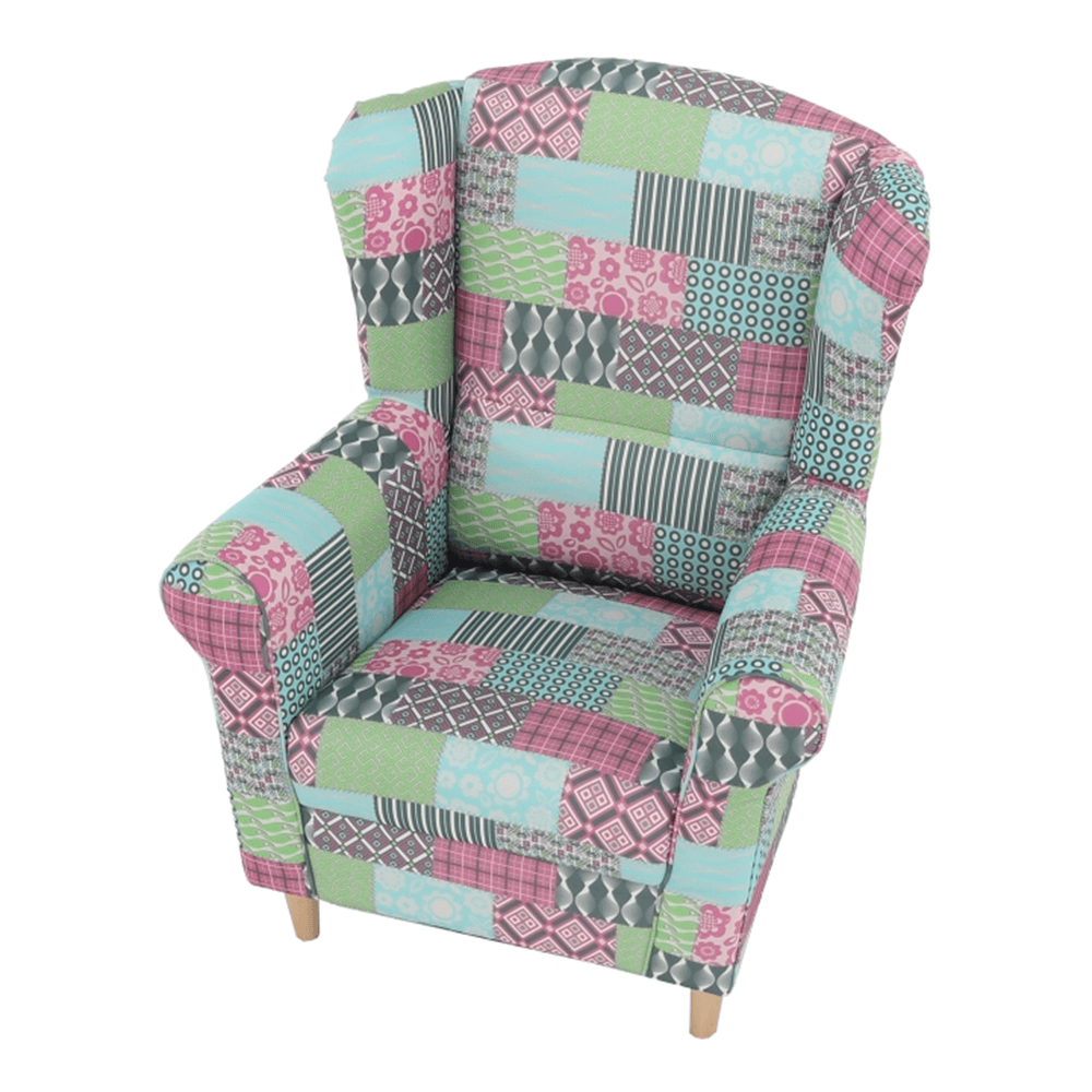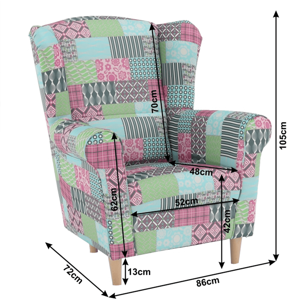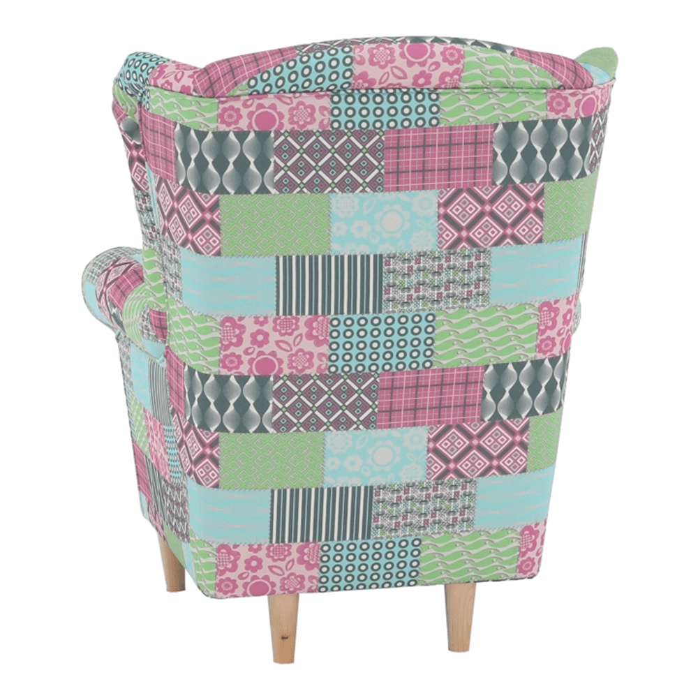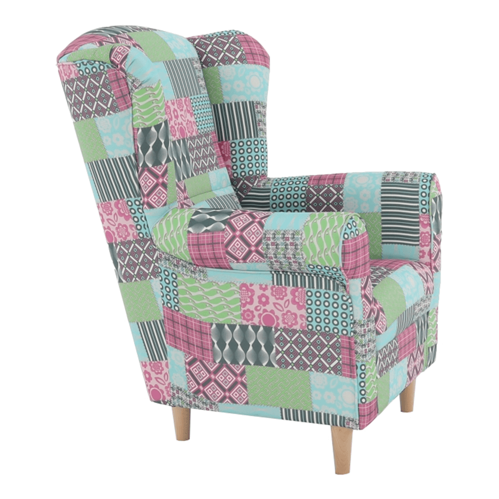 Füles fotel CHARLOT patchwork M1 szövet változatban. A fa lábak bükk színváltozatban készültek.