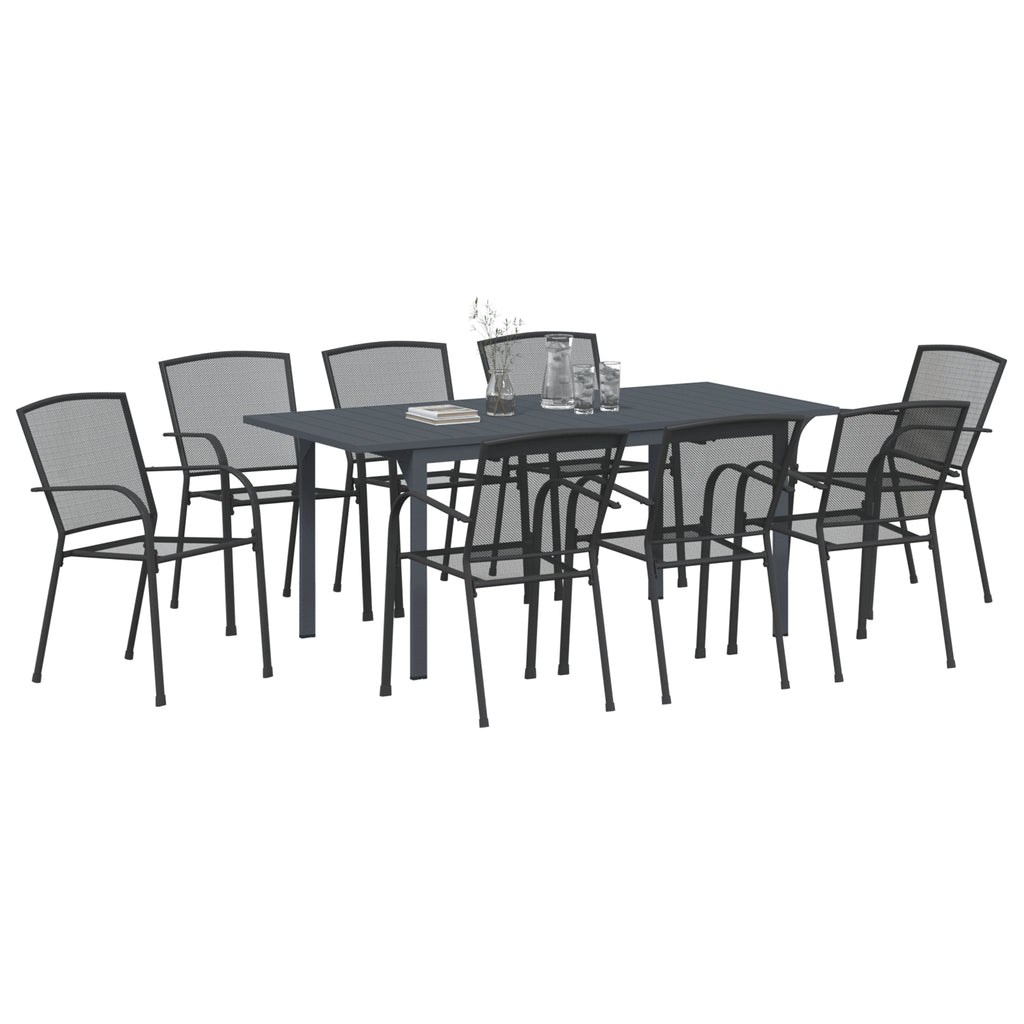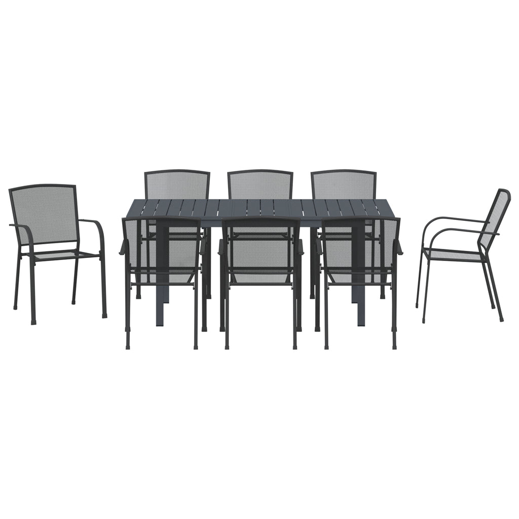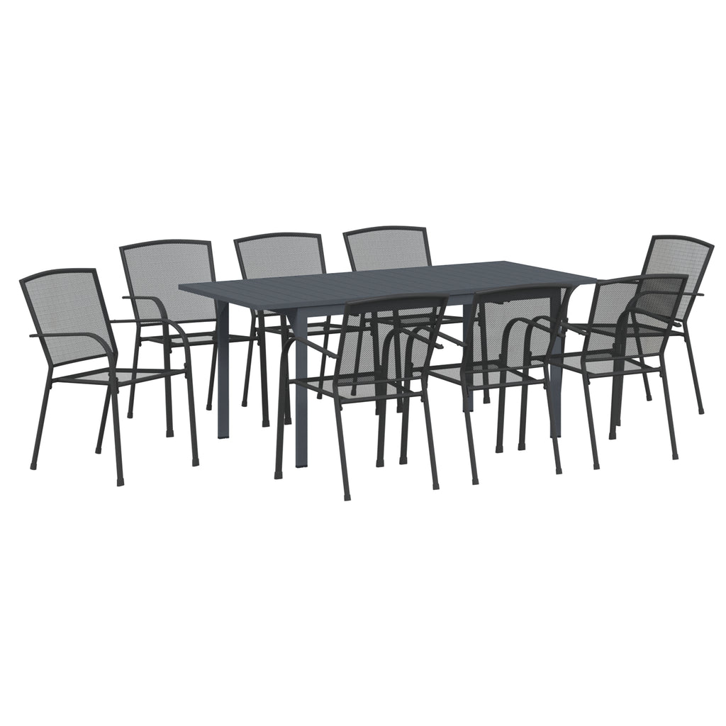Ez a kerti étkező garnitúra a stílust és a hasznosságot vegyíti, tökéletes kültéri összejövetelekhez barátokkal és családdal. Letisztult, téglalap alakú dizájnnal rendelkezik, a garnitúra egy tágas asztalt és nyolc összecsukható széket tartalmaz, amit könnyedén lehet használni az étkezésekhez.
