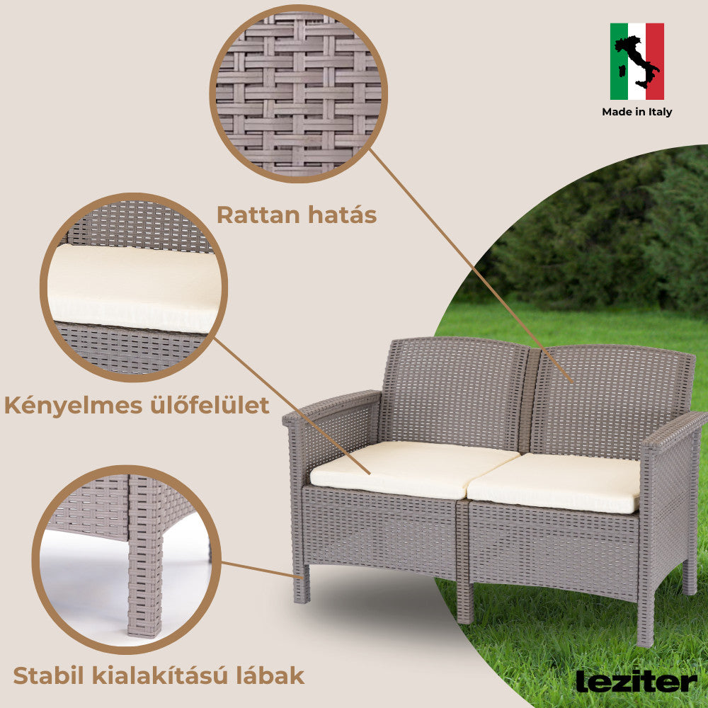 Ez az Olaszországban gyártott, barna színű, kényelmes és elegáns bútor szett kettő 63 x 64,5 x 76 cm-es fotelt, kettő kétszemélyes 117 x 64,5 x 76 cm-es kanapét és egy négyszögletes 60 x 54,5 x 40,5 cm-es asztalt foglal magába. A Venus Big 6 személyes szett elegendő helyet biztosít az egész család, vagy a barátok számára, hogy a szabad levegőn tudják tölteni az időt, vagy egy kellemes vacsorát.