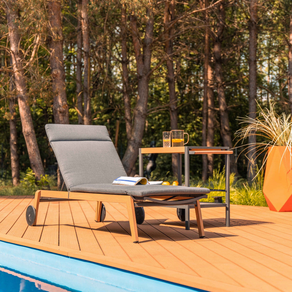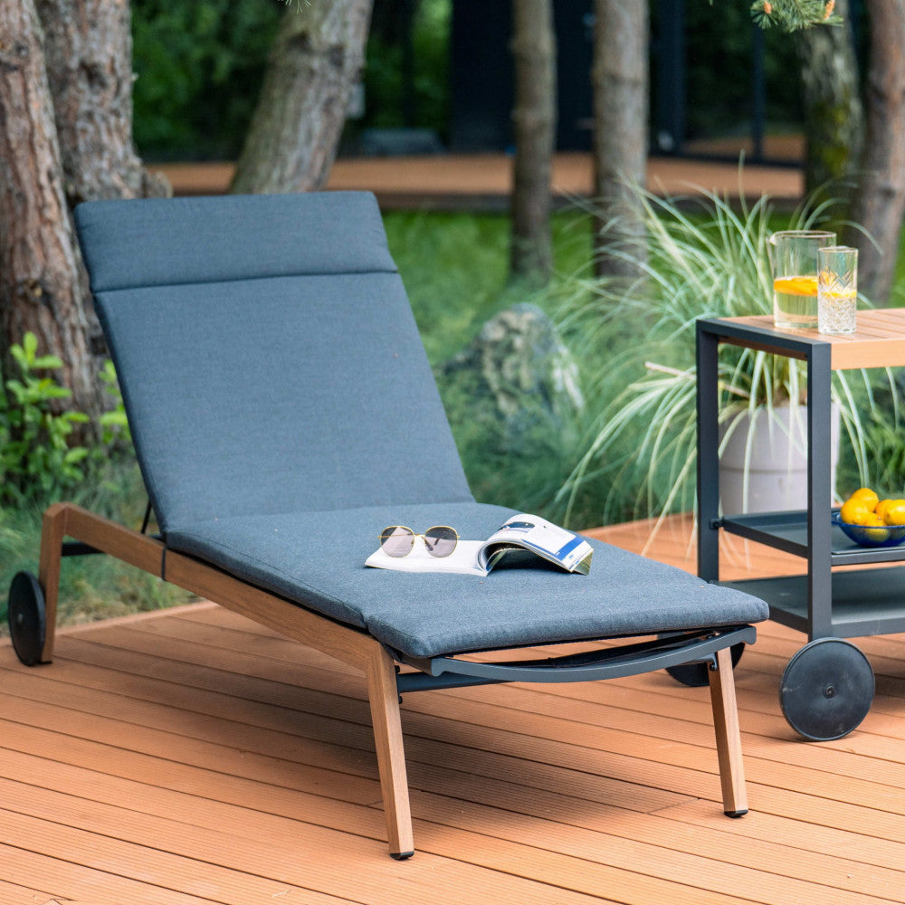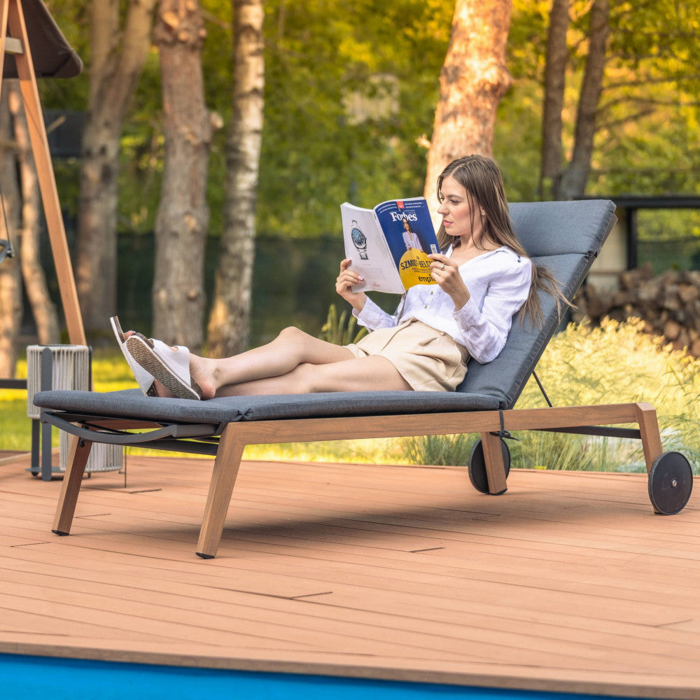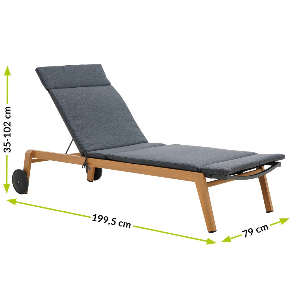 A nyugágyat modern és elegáns kialakítása jellemzi. Az antracit ülés és a fautánzó keret kombinációja tökéletesen illeszkedik a modern és minimalista elrendezésbe. A dizájnos nyugágy mindenki számára ajánlott, aki értékeli a funkcionalitás és a kiváló stílus kombinációját.
