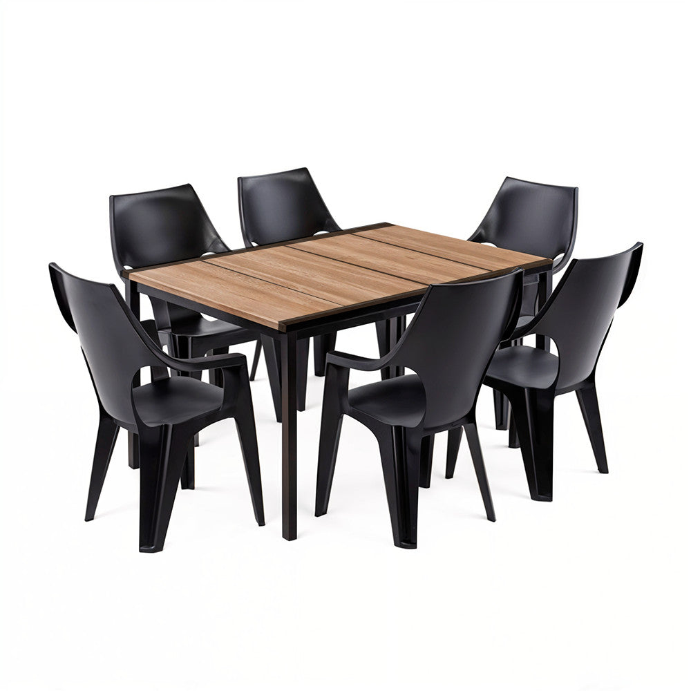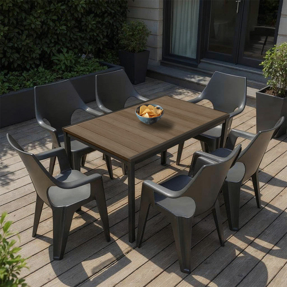 A Parker 6+1 Kerti Bútor Garnitúra Szett minden darabja prémium minőségű, időjárásálló anyagokból készült, melyek biztosítják a hosszú távú használatot és a könnyű karbantartást. Az asztallap műanyagból készült, de a DecoCoat™ technológia alkalmazásával fa hatású megjelenést kapott, így nemcsak esztétikailag hasonlít a valódi fához, hanem karcálló és UV-álló is. Ezáltal nem kell aggódnod, hogy az időjárás vagy a napi használat miatt gyorsan elhasználódik.