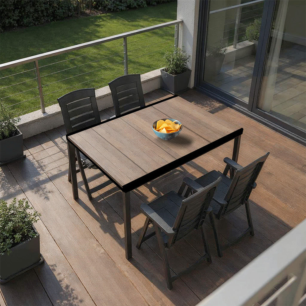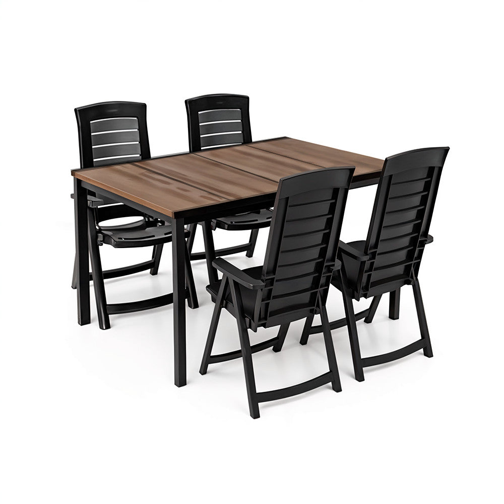 A garnitúra bútorai prémium minőségű anyagokból készültek, melyek ellenállnak az időjárási viszontagságoknak, UV-sugárzásnak, fagynak és magas hőmérsékletnek is. A DecoCoat™ technológiával készült dió hatású műanyag asztallap természetes fa megjelenést nyújt, miközben teljesen karcálló és vízálló. A stabil fémváz biztonságos használatot garantál, hosszú évekig megőrizve esztétikus megjelenését.