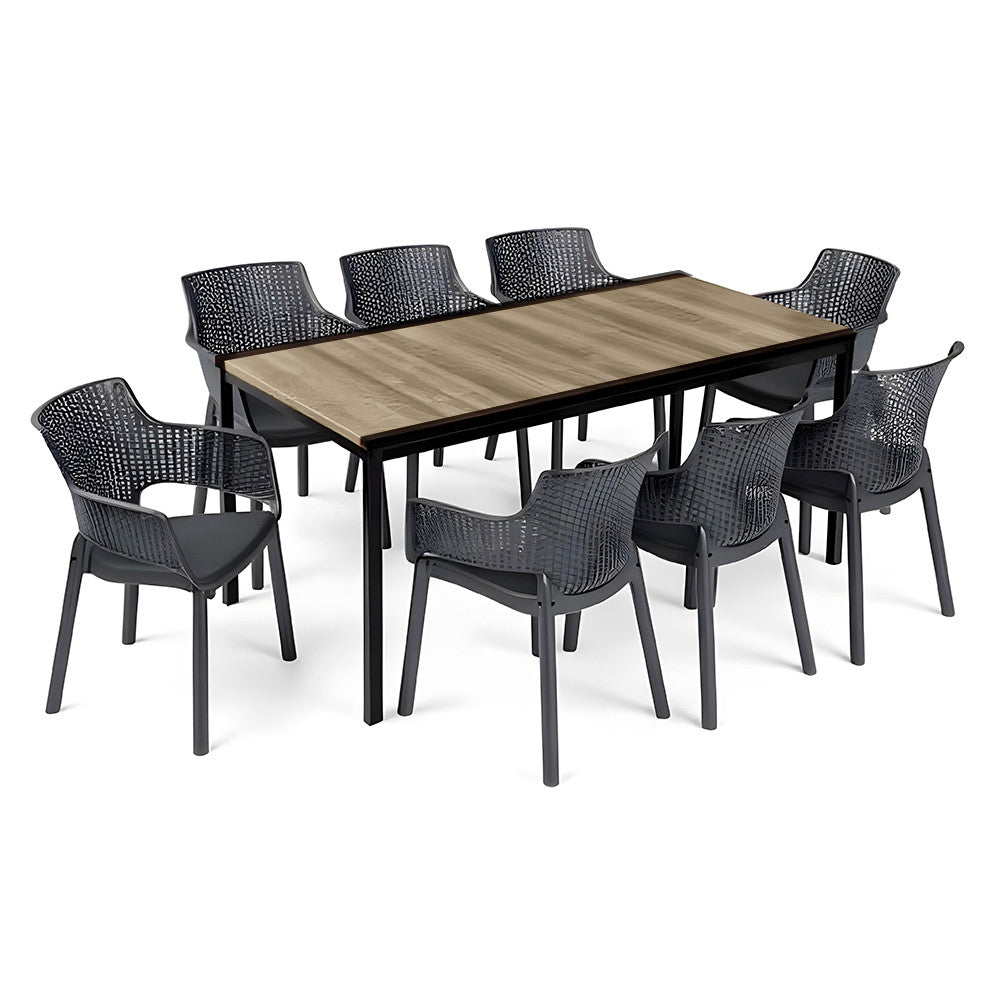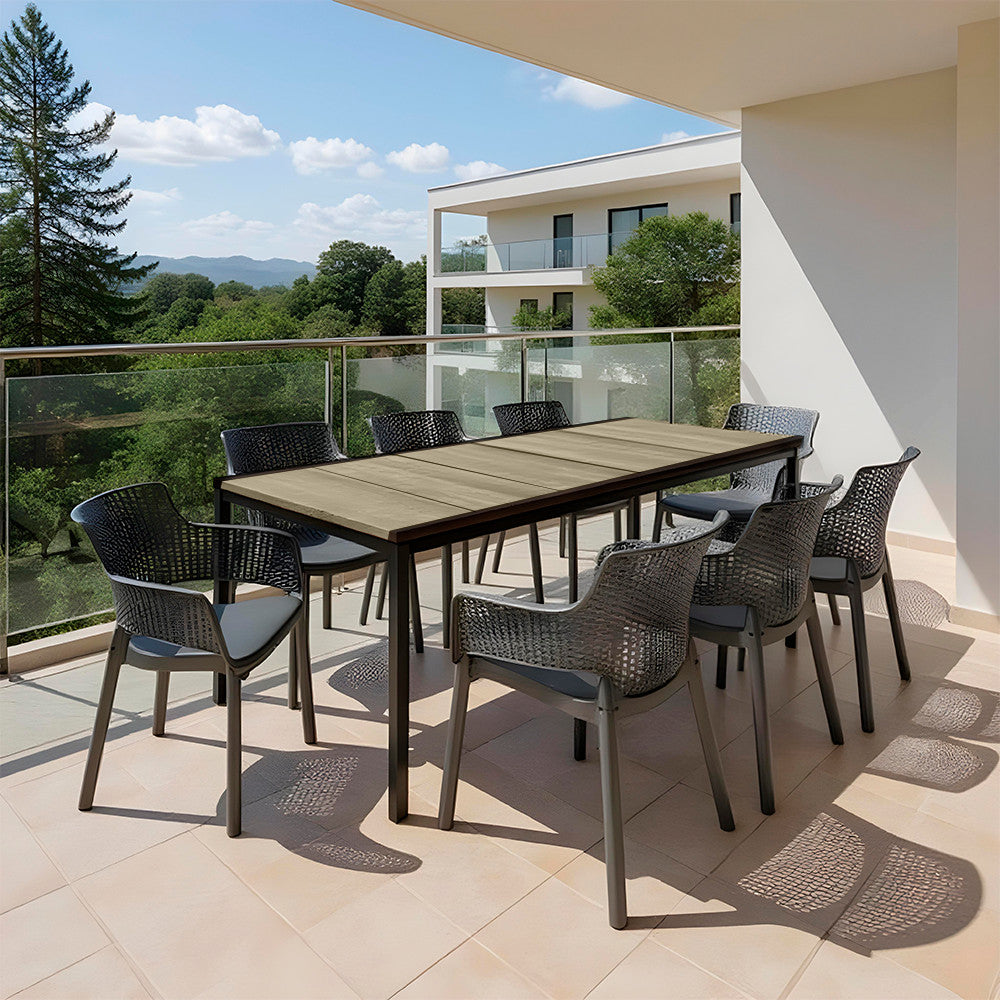 A meleg kőris tónusú asztallap és a mély grafit székek elegáns, kortárs hangulatot teremtenek. Legyen a teraszod skandináv, mediterrán vagy ipari stílusú, a Romen Large garnitúra központi elemmé válik, ami stílust és harmóniát kölcsönöz a kültéri térnek.