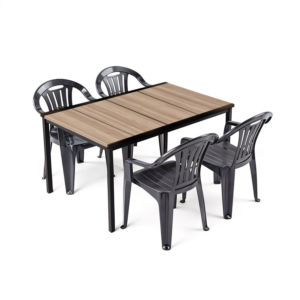 A hűvös grafit székek a valósághű rattan textúrával modern, mégis otthonos hangulatot teremtenek. Ehhez társul a kőris árnyalatú, fa-hatású asztallap, amely elegáns kontrasztot ad; bármilyen stílusú kertben, erkélyen vagy vendéglátó-teraszon lenyűgöző látvány.