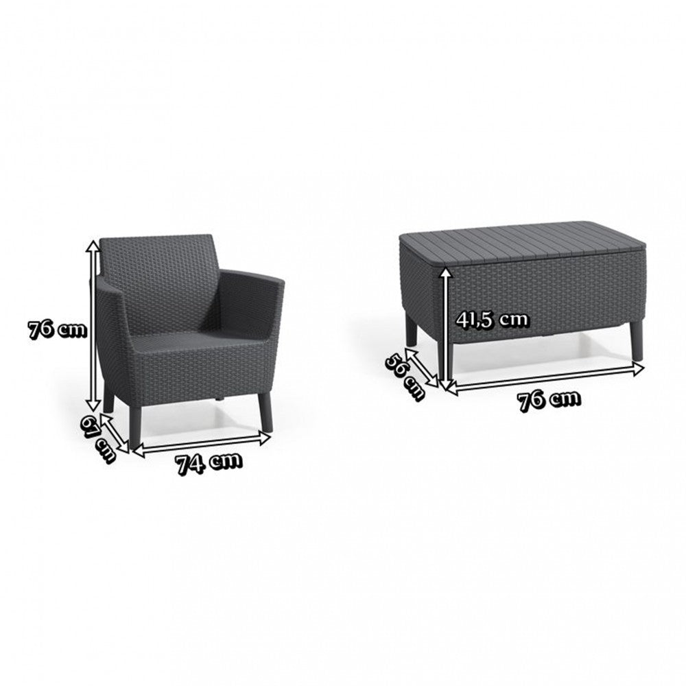 A kényelemről puha ülőpárnák, megfelelően profilozott háttámlák és széles karfák gondoskodnak, amelyeken megpihenheti a kezét. A szett szerves részét képző dohányzóasztal alapfunkciójában nagyon jól működik, de tárolóként is használható. Tárolhatja azokat a tárgyakat, amelyeket szeretne kéznél tartani.
