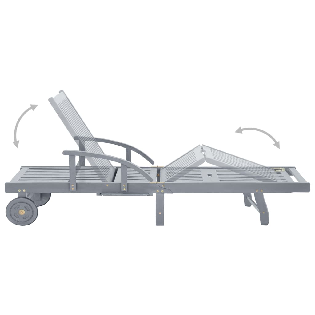 Ez a kültéri napozóágy szürke koptatott felületű tömör akácfából készült, így masszív és stabil. A háttámla és a lábtartó állítható, és a nyugágyat a kívánt helyzetben rögzítheti. Ez a kerti napágy a 2 kerekével könnyen mozgatható a ház körül. A napágy kényelmes kihúzható asztallal rendelkezik, amelyre telefonját, napszemüvegét, italát és egyéb apróságokat helyezhet. A párna extra kényelmet biztosít pihenés közben. Minden párna két kötélszettel van ellátva, hogy szorosan rögzíthesse őket a napozóágyon.