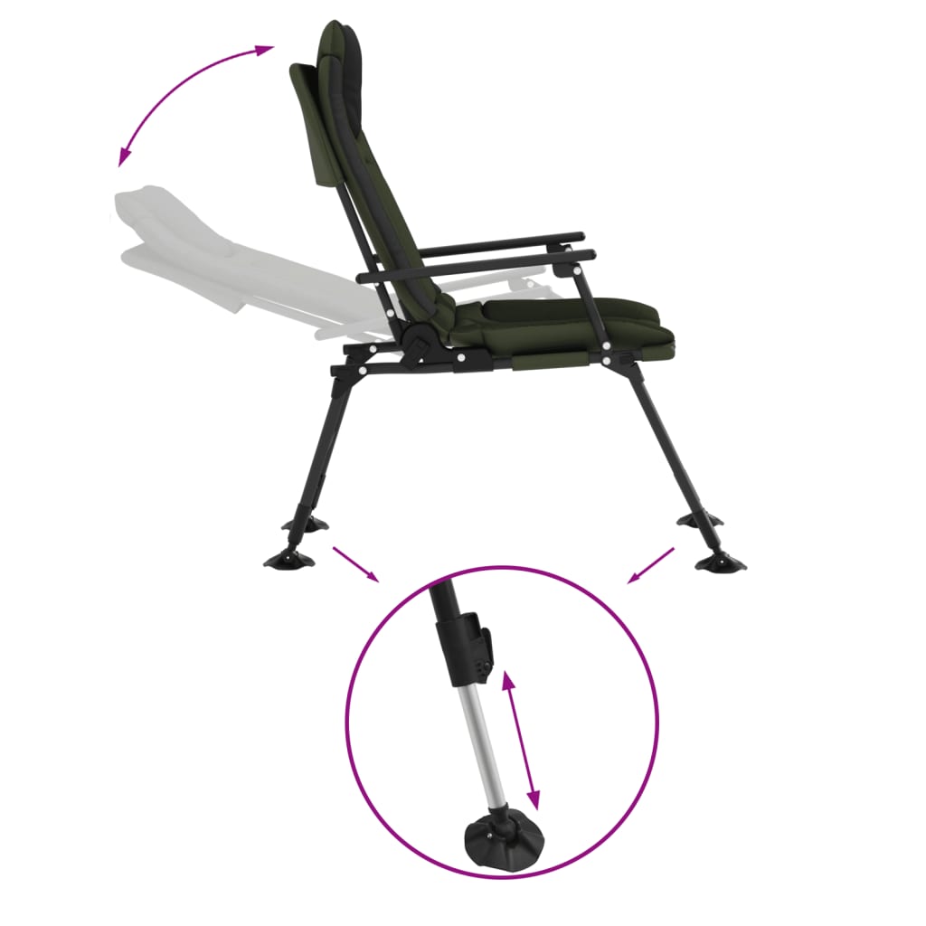 • Praktikus kialakítás: A horgászszék állítható, sárgyűjtőkkel ellátott lábakkal rendelkezik, biztosítva a kényelmes használatot még egyenetlen terepen is, és megakadályozva, hogy puha talajba süllyedjenek.