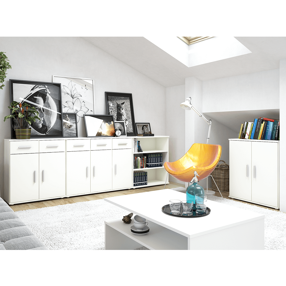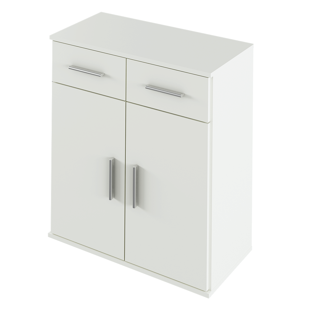 Anyag: laminált DTD Szín: fehér Méretek (SzxVxH): 70,6x35x79,5 cm Kétajtós Polcos Két fiók Fogantyúval Szétszerelve szállítva